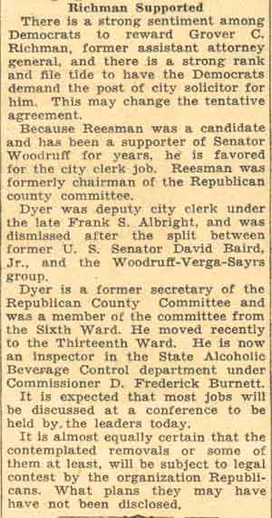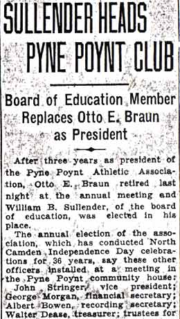 POYNT PLANS ALL-DAY 4TH PARTY Plans for the thirty-third anniversary of the Pyne Poynt Athletic Association to be observed with an all -day program at Pyne Poynt Park July 4 were discussed last night at a meeting in the Pyne Poynt Social Club, 929 North Fifth Street. Among the features tentatively planned are a children's parade at 9.30 a. m., under the supervision of Isaac Kyler; memorial service at 11 a. m., under direction of William B. Sullender; sporting events for men, women and children to start at 1.30 p. m., under direction of Alfred J. Ross, Jr.; outdoor motion pictures starting at 9 p. m., under supervision of Robert J. Nelson and a dance in charge of Samuel G. Dickinson, Jr., starting 11t 10.30 p. m. Committee chairmen chosen by Frank J. Hartmann, Jr., president, are: Grounds, Foster Willis; program, Otto E. Braun; police, Clifford Flennard; dancing, Samuel G. Dickinson, Jr.; first aid, Dr. Joseph E. Nowrey and William Hughes; transportation, Samuel J. Edwards; public speakers, William B. Sullender ; motion pictures, Robert J. Nelson; decorations, Walter A. Reyno; sports, Alfred J. Ross, Jr.; ways and means, Frank J. Hartmann, Jr.; publicity, Walter S. Agin; parade marshal, Isaac Kyler; refreshments, George Washington Ash; light, William Hilton, and music, Frank Kelley. Children of the Sheltering Arms Home, Home for Friendless Children and the Detention Home will be guests of the association during the day. Samuel J. Edwards will be in charge of their entertainment. The association will meet again next Thursday night. |