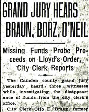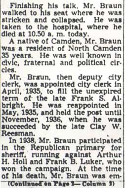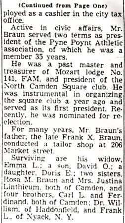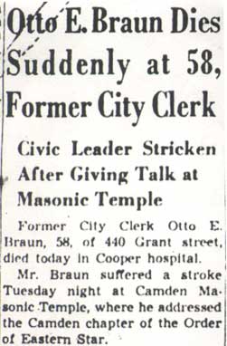 OTTO E. BRAUN was born around 1891 to Mr. and Mrs. Francis X. Braun. Francis X. Braun was born in Germany in 1865. He was a tailor, and had lived and worked at 562 Auburn Street in Camden according to the 1889-1889 city directory. In the 1990-1891 directory, Francis X. Braun had his tailor shop at 124 Market Street, and his residence at 647 South 3rd Street. His customers were largely executives from the Victor Talking Machine Company, Esterbrook Pen, Campbell Soup, J.B. Van Sciver, and other area businesses. Besides Otto, their was a brother, William, and two sisters, Beatrice and Justine "Tine" Braun. Frank Braun passed away in 1912. Otto Braun wed around 1915. At the time of the 1920 census he was living with wife Emma at 317 pearl street in North Camden, and working as a timekeeper in a factory. By April of 1930 he had taken a position as a cashier in the city tax office, and the Braun family had purchased a home at 440 Grant Street in North Camden. Otto E. Braun was a member of Mozart Lodge No. 121, Free and Accepted Masons. He was elected to a one-year term as the lodge's Master in 1926. His father had served in that position in 1900. A staunch Republican, Otto Braun served under Mayor Frederick von Nieda as City Clerk for Camden from April 1935 to November of 1936. He succeeded Frank S. Albright, who died in office. Otto Braun then returned to his post in the tax office, where he worked alongside former Camden pro basketball star Eddie Ferat. He was a member of the Pyne Point Athletic Association from the time he moved to North Camden until his death. During that 35 year period he was president of the organization twice. He was succeeded in that post in October of 1936 by William B. Sullender. Otto Braun was also active in other civic and fraternal groups. Otto Braun suffered a fatal stroke shortly after giving a speech at Camden's Masonic Temple at 4th and Arch Streets. He passed away on February 17, 1950 ar Cooper Hospital. |