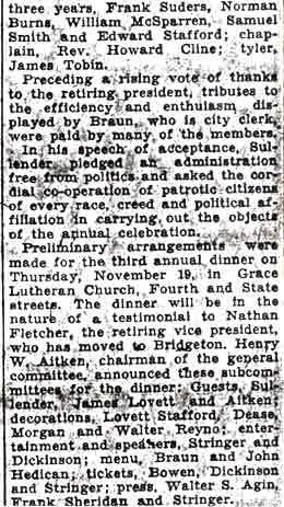 The tenth annual ball of the Tenth Ward Republican Organization Club, Fifth and Pearl streets, will be held February 28 at Eagle's auditorium, 415 Broadway. William Dolan, Jr. is chairman; William B. Sullender, treasurer, and Fred Becker, secretary of the general committee. The members of the other committees are as follows: Hall, Louis Kahnweiler, chairman, Harry Everhart, James Flaherty; advertising, Henry W. Aitken, chairman, John Stringer, Frank Sheridan and Andrew Robinson; door, Alonzo Hires, chairman, Andrew Robinson, Jacob Strecker; music, Becker, chairman, William B. Chain, William Robinson and Andrew Robinson; printing, Stringer, chairman, Dolan and Harry Harwood; refreshment, George Morgan, Ralph Shill, Charl es Bowen, Harry Harold, Edward Stafford, Henry Clevenger and Frank Turner; program, Stafford, chairman, Charles Marsh, John Hedegan, Otto E. Braun, George Zietz, William Hughes, Earl Wright , Albert C. Raeuber, Charles Schultz, Stringer and Dolan; floor, Becker, chairman, Garwood, Judson Solley, Howard E. Baird, William Lafferty, James F. Lovett, Henry I. Haines, William Robinson, Braun and Samuel J. Edwards audit, Dolan, Garwood, William Robinson, and Aitken; wardrobe, Marsh, chairman, Benjamin Harvey and George Cox; tickets, John Winstanley, chairman; executive, Dolan, chairman, Stringer, William Robinson, Sullender and Haines. The Penn Troubadors will play for dancing. |