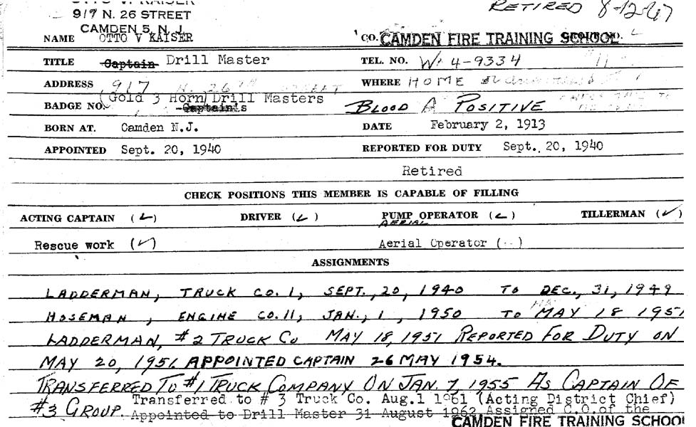 OTTO V. KAISER was born in Camden, New Jersey on February 2, 1913 to Marie and Charles G. Kaiser. His parents both came to America as children, Marie from Norway, Charles from Switzerland, and wed around 1903. By 1910 and well into the 1920s they were living at 904 North 26th Street in Camden's Cramer Hill section. Charles Kaiser worked in Camden's shipyards to support his family. Otto Kaiser was one of at least seven children, born after older siblings Charles S., Roy, Elsie, and John, while coming before little sisters Margaret and Elizabeth. Otto Kaiser was still living at 904 north 26th street as late as 1947. By that time he was married to his wife, Alberta. Otto Kaiser later made his home at 917 North 26th Street in Cramer Hill. Otto V. Kaiser was appointed to the Camden Fire Department on September 20, 1940. He reported for duty the same day at Ladder Company 1, then based at the old Fire headquarters at North 5th and Arch Streets, where her served until December 31, 1949. On January 1, 1950 Otto Kaiser was transferred to Engine Company 11 on North 27th Street in Cramer Hill, where he worked until May 18, 1951 when he was sent to Ladder Company 2, 619 Kaighn Avenue in South Camden. Three years later, on May 26, 1954 Otto Kaiser was promoted to Captain. He remained at Ladder Company 2 until January 7, 1955 when he was returned to Ladder Company 1. On August 1, 1961 Captain Kaiser was sent to Engine Company 3 at 1815 Broadway where he served at Acting District Chief (duties akin to that of present-day Battalion Chief). 13 months later, on August 31, 1962 Otto V. Kaiser was promoted again, to the post of drillmaster at the Fire Training School, where he worked until his retirement, August 12, 1967. Otto Kaiser passed away in August of 1976. He was then a resident of Wittman, in Talbot County, Maryland. He was survived by his wife, who passed in September of the following year. |