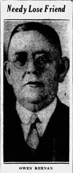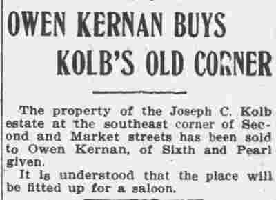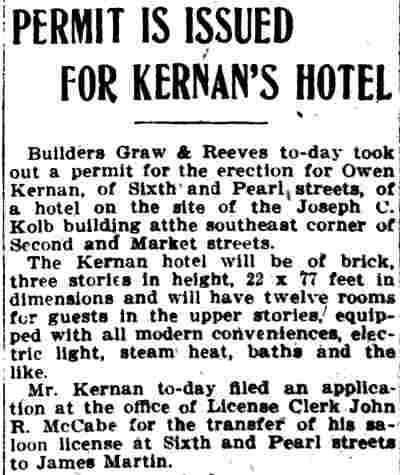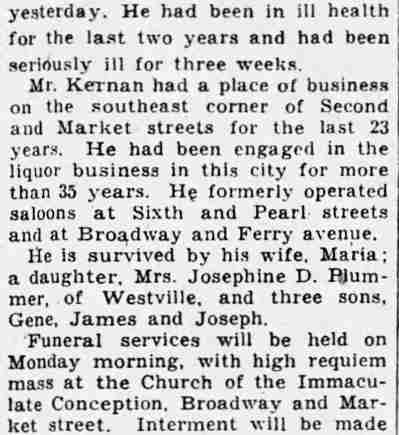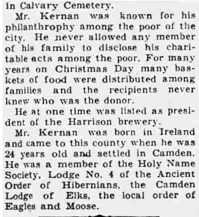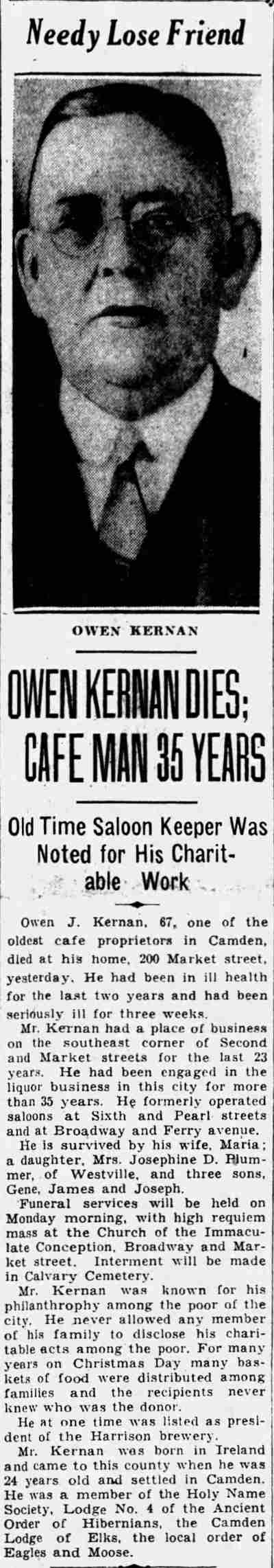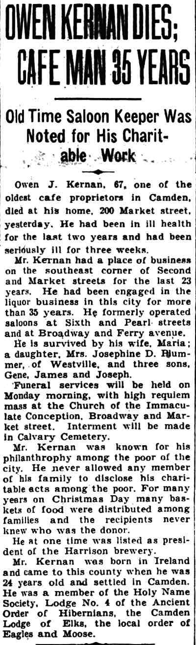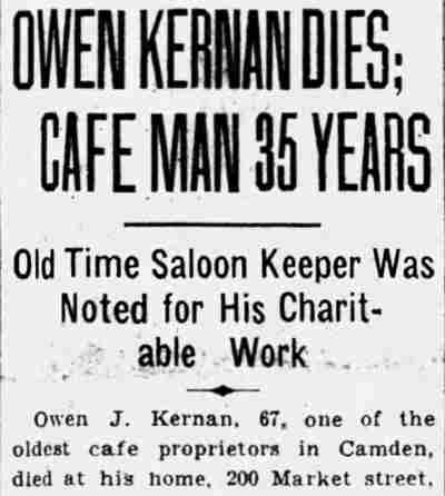 OWEN KERNAN was born in Carrickmacross, County Monaghan, Ireland on June 20, 1866. He came to American in 1886 and married MArgaret Finnegan in Philadelphia in 1891. He soon moved to Camden, where the first of five children was born in February of 1893. After working as a lineman, Owen Kernan went into the bar business, a trade he would follow in Camden for over 35 years, the last 22 of them at 200 Market Street. He first went into the liquor business in 1901, at 800 Fern Street. At some point in 1903 he moved his operation to 1735 Broadway, a building known as the Flatiron Hotel, due to its triangular shape. In June of 1906 he took over the bar at 601 Pearl Street. During the summer of 1911 Owen Kernan bought the building at 200 Market Street. In September of 1911 he contracted with the firm of Graw & Reeves to build a three-story brick building at that address, which was completed in three months time. Owen Kernan opened for business in January of 1912. Owen Kernan passed away on January 4, 1934. The Kernan family remained in business at 200 Market Street until 1956, when they sold they property to Campbell Soup, who took possession of the building on March 1. Son Joseph Kernan wanted to move the business to 223 Market Street, but was denied permission to transfer his liquor license, due to their already being three bars in the immediate vicinity. He subsequently sold the liquor license to My-Friends, Inc., who opened a bar called My Friends at 2643 Mt. Ephraim Avenue. |