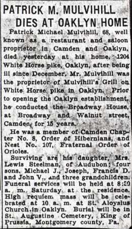PATRICK MICHAEL MULVIHILL was a well known bar owner in Camden around the time of World War I, He operated a bar known as the Broadway House at 1001 Broadway, the corner of Broadway & Walnut Street, for 15 years before moving to Oaklyn NJ, where operated Mulvihill's Grill at 1204 White Horse Pike. Patrick M. Mulvihill passed away on October 21, 1936, after taking sick in December of the previous year. He was buried in King of Prussia PA. |