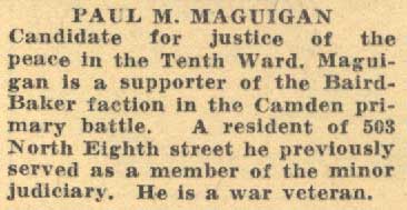 PAUL M. MAGUIGEN was born on April 27, 1895. He was a veteran of World War I who lived in North Camden after the war. He was active in Republican politics, and served in the minor judiciary in Camden. In 1934 Paul Maguigen was living at 503 North 8th Street. He supported David Baird Jr. over Albert S. Woodruff in the bitterly contested May primary election to determine control of Camden County's Republican party, and was a candidate for the party nomination for justice of the peace. The 1947 Camden City Directory shows that Paul and Eleanor Maguigen were then living at 404 North 7th Street, and that he was employed by Camden's Police Department. He was not listed in the 1959 New Jersey Bell Telephone Directory for Camden County. Paul Maguigen passed away in November of 1972. |