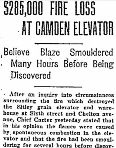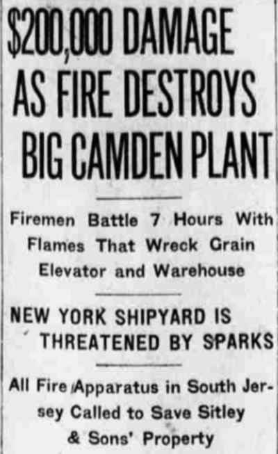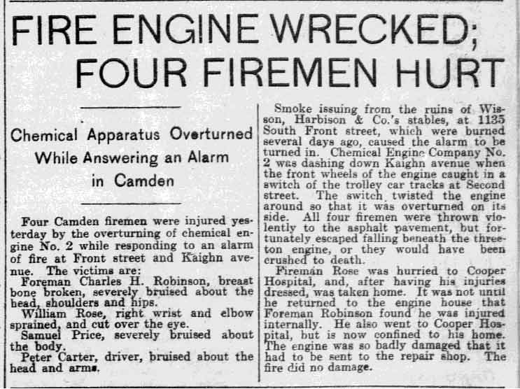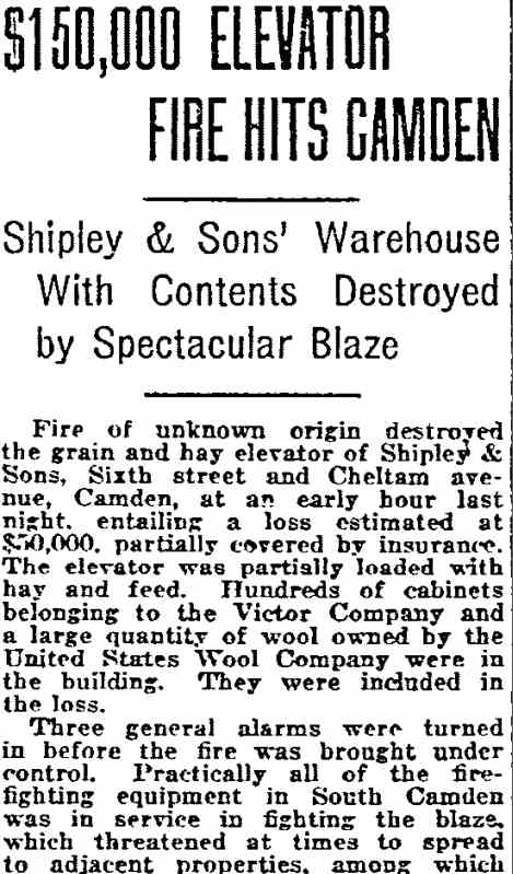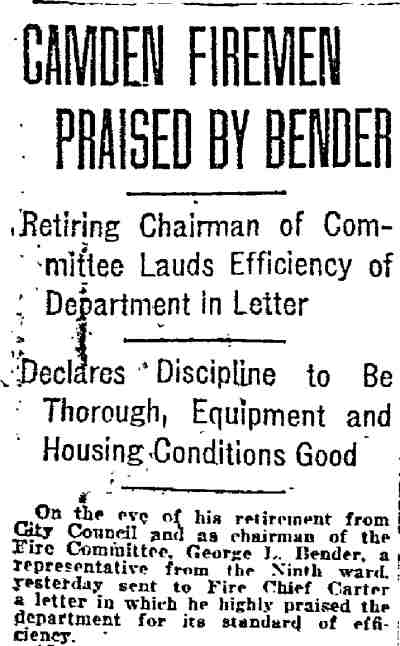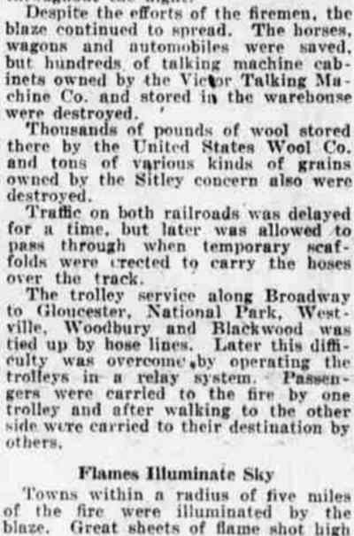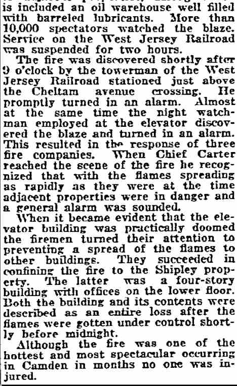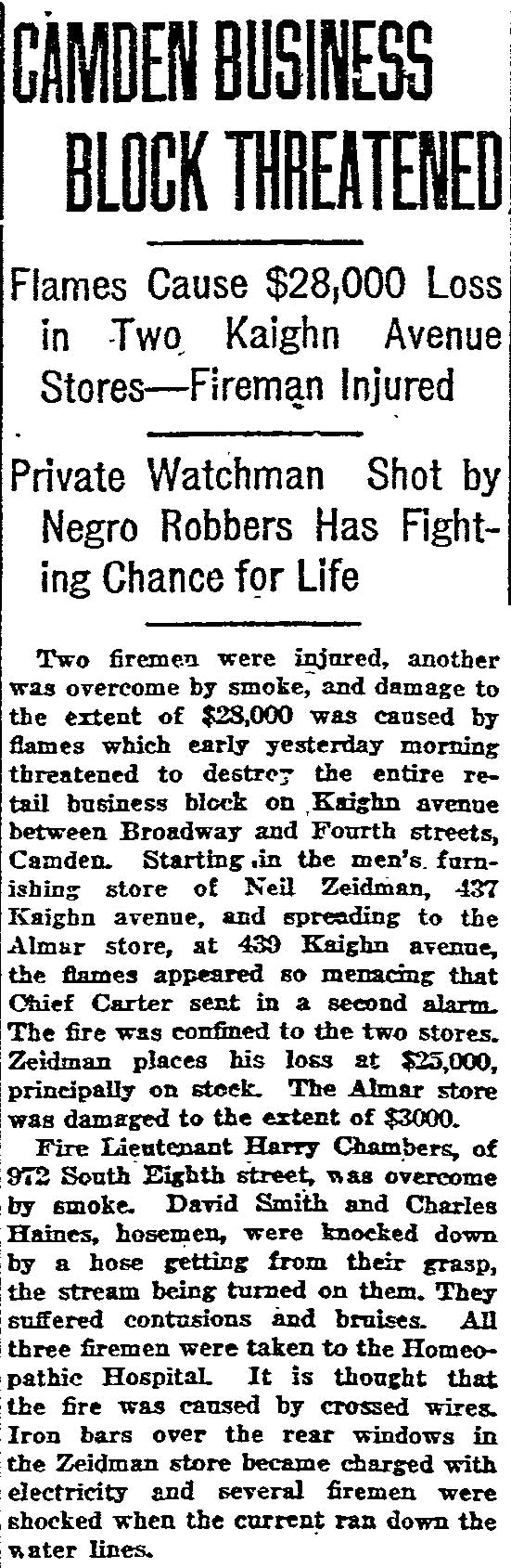 KAIGHN AVE. FIRE FIRE CAPTAIN MAY DIE, FOUR OTHERS INJURED; DAMAGE IS $200,000 Economy Store and Other Buildings Near Broadway Swept by Flames Early This Morning- Falling Debris Carries Men Through Roof And Into Cellar- Sleeping Inmates of Apartments Roused and Invalid Carried to Safety- Mayor Sees Rescues Mayor Ellis has ordered an investigation to determine the cause of the $2000,000 fire which swept the properties at 427 and 429 Kaighn Avenue and caused injury to five firemen, one of whom may be fatally hurt. The fire centered about the property occupied by the Economy Store, formerly Handle’s, and quickly spread to four adjoining buildings. The fireman whose recovery is despaired of is Captain Martin B. Carrigan, of Engine Company No. 2, Fifth and Arch Streets. Carrigan, who lives at 618 West Street, is suffering from a fractured skull and severe burns and cuts of the face, legs, and body. He is unconscious at Cooper Hospital. The firemen were injured when a wall, weakened by the intense heat, crumbled and crashed through a roof upon which they were standing, dragging them through the floor below, and into a cellar. Sensational rescues followed as police, firemen, and citizens with bare hands tore at the hot debris. The men were quickly extricated and carried to the street. “We certainly shall investigate this fire,” the Mayor declared today. “Just what was the cause and who is to blame has not been determined but there will be a thorough investigation.” “There have been too many of these fires during the past few weeks” continued the mayor. “Surely all of them did not just happen and I am sure there has been someone responsible in one or two of the fires.” The conflagration was one of the most spectacular of a series of large fires that have visited the city in the past six weeks. The block in which it occurred- Kaighn Avenue between Broadway and Fourth Street is one of the most prominent business squares in Camden. Flames shot 200 feet in the air, giving the sky a fiery hue and attracted attention for miles before the firemen brought it under control. The flame-lit sky was clearly seen in Philadelphia, Merchantville, East Camden, Gloucester and other communities. More than a score of families living in the vicinity were forced to flee from their homes in scant attire when the fire threatened them. They were cared for by neighbors. Fireman George Boone, 46 years old, of Engine Company No. 2, also is in a serious condition. He is suffering from burns of the right hand, right thigh and foot and probable internal injuries. Boone lives at 607 Mount Vernon Street. The other injured foremen are: John Voll, 22 years old, 509 Royden Street: both hands badly burned. C.J. Andrus, aged 31 years, 570 Mount Vernon Street: burns of hands and legs. Harold Lorang, 29 years old, 19 Hudson Street: burns of right hand and legs and sprained ankle. Firemen Prove Heroes Carrigan and Boone are in the hospital. The other firemen were discharged after their wounds were dressed. After being released from the hospital they returned to the scene of the fire and insisted upon continuing their duties. Chief Peter B. Carter, however, ordered them home. Most of the loss was suffered by the Economy Store. A few charred walls remain of the large building. The interior was completely gutted. It was estimated today that the damage to that property will total $60,000 At least $50,000 damage, it was said, was done to the stock. Morris Handle, local theatrical man, who owns the building, declared today that the property was insured for $30,000. “My loss will be quite heavy,” said Mr. Handle. “The insurance will not pay one-half the property damage.” The adjoining building at 431 Kaighn Avenue is occupied by Dr. S.I. Yubas, optometrist, and L.R. Yubas, his father, a jeweler. Invalid is Rescued The rear and upper floors of the Yubas property were gutted and the stock sustained a heavy loss, due to water and smoke. The damage will total $40,000, Mr. Yubas estimated today. Five persons who were asleep on the upper floors of the Yubas dwelling had narrow escapes. They were awakened by Samuel Goldstein, haberdasher, 417 Kaighn Avenue, who discovered the fire in the Economy Store and turned in the alarm. Mrs. L.R. Yubas, an invalid, was rescued with difficulty. The property occupied by Mrs. Sadie Bodner, a widow, at 433 Kaighn Avenue, as a house furnishings store, was scorched and also damaged by water and smoke. Adjoining the Economy Store on the west at 425 Kaighn Avenue is a vacant one-story structure, formerly occupy by the United Beef Company. Firemen were on the roof of that building when the west wall of the Economy Store collapsed. The wall tumbled down on the small roof and hurled the firemen through a hole in the roof, through the floor and then into the cellar. Several Stores Damaged Three policemen, Joseph Sparks, Thomas Cheeseman, and George Hill- and several spectators braved the fire and smoke to rescue the trapped firemen. The property at 423 Kaighn Avenue, occupied by the Charles Jamison Department Store, was damaged in the rear and the stock ruined by water and smoke. The Kresge Five-and-Ten-Cent Store, at 519-531 Kaighn Avenue, was also damaged by water. Louis Richelson, who owns the properties from 519 to 525 Kaighn Avenue, was unable to estimate his loss today. Collapse of Wall Hundreds of spectators, who were watching the fire from the opposite side of the street, shuddered as they saw a brick wall, weakened by the intense heat, totter and sway. Before the firemen on the smaller roof below could scurry to safety, it collapsed. A groan escaped the crowd as they heard the cries of the entrapped firemen and the deafening thud of the brocks as they landed on the roof where the firemen were at work. As the full weight of the brocks struck the roof, it caved in forming a gaping hole. The firemen were literally swept into the opening. The bricks tumbled down, causing another hole in the 