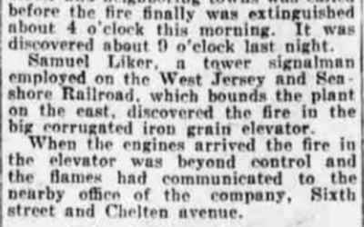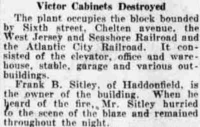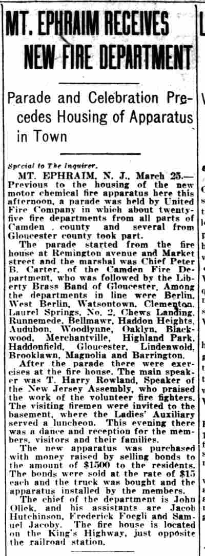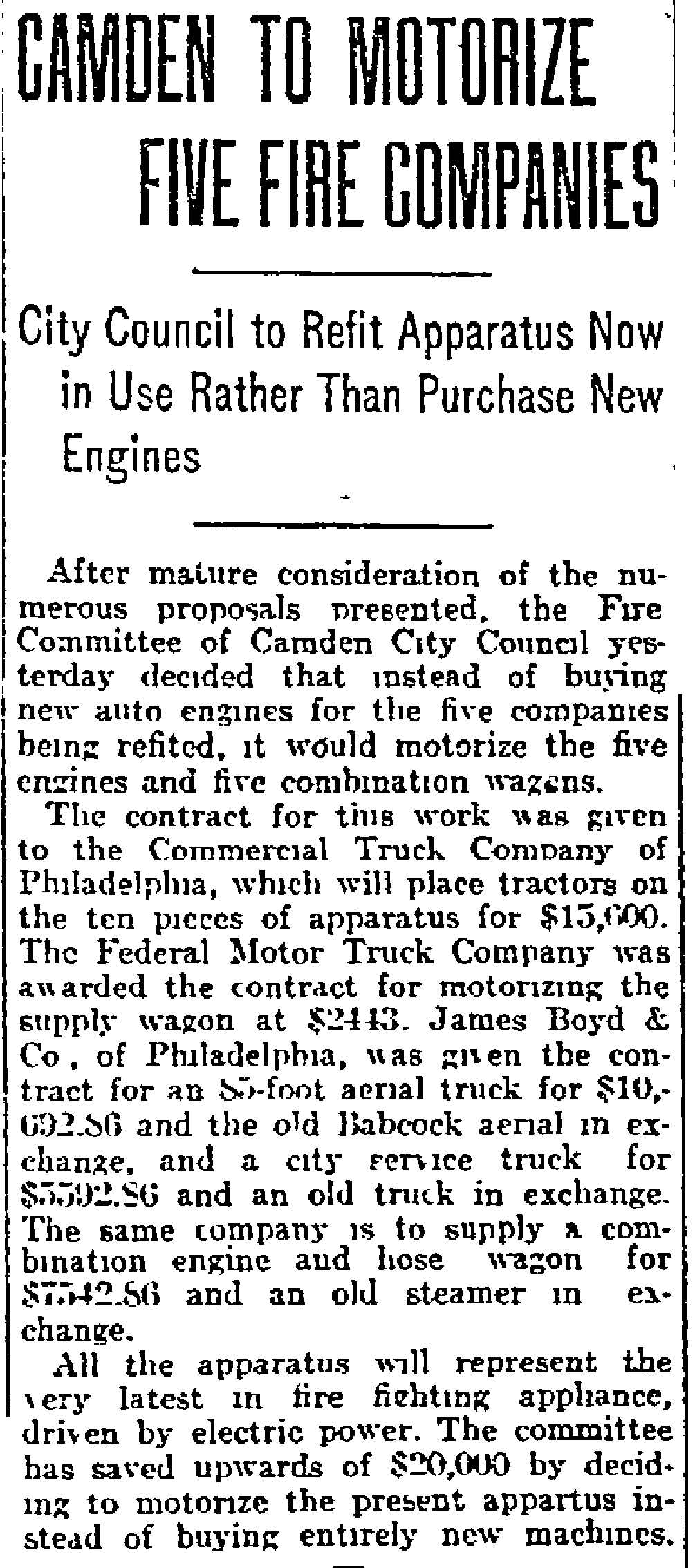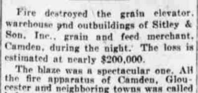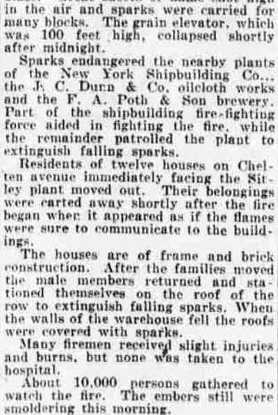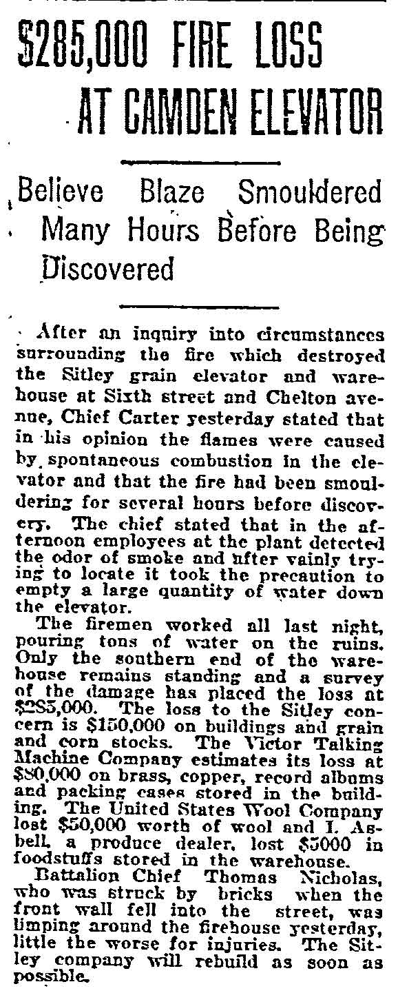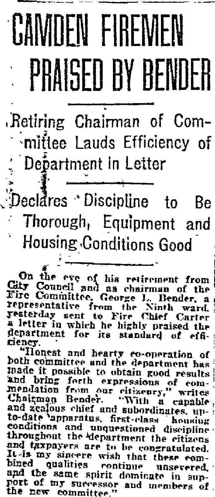 KAIGHN AVE. FIRE FIRE CAPTAIN MAY DIE, FOUR OTHERS INJURED; DAMAGE IS $200,000 Economy Store and Other Buildings Near Broadway Swept by Flames Early This Morning- Falling Debris Carries Men Through Roof And Into Cellar- Sleeping Inmates of Apartments Roused and Invalid Carried to Safety- Mayor Sees Rescues Mayor Ellis has ordered an investigation to determine the cause of the $2000,000 fire which swept the properties at 427 and 429 Kaighn Avenue and caused injury to five firemen, one of whom may be fatally hurt. The fire centered about the property occupied by the Economy Store, formerly Handle’s, and quickly spread to four adjoining buildings. The fireman whose recovery is despaired of is Captain Martin B. Carrigan, of Engine Company No. 2, Fifth and Arch Streets. Carrigan, who lives at 618 West Street, is suffering from a fractured skull and severe burns and cuts of the face, legs, and body. He is unconscious at Cooper Hospital. The firemen were injured when a wall, weakened by the intense heat, crumbled and crashed through a roof upon which they were standing, dragging them through the floor below, and into a cellar. Sensational rescues followed as police, firemen, and citizens with bare hands tore at the hot debris. The men were quickly extricated and carried to the street. “We certainly shall investigate this fire,” the Mayor declared today. “Just what was the cause and who is to blame has not been determined but there will be a thorough investigation.” “There have been too many of these fires during the past few weeks” continued the mayor. “Surely all of them did not just happen and I am sure there has been someone responsible in one or two of the fires.” The conflagration was one of the most spectacular of a series of large fires that have visited the city in the past six weeks. The block in which it occurred- Kaighn Avenue between Broadway and Fourth Street is one of the most prominent business squares in Camden. Flames shot 200 feet in the air, giving the sky a fiery hue and attracted attention for miles before the firemen brought it under control. The flame-lit sky was clearly seen in Philadelphia, Merchantville, East Camden, Gloucester and other communities. More than a score of families living in the vicinity were forced to flee from their homes in scant attire when the fire threatened them. They were cared for by neighbors. Fireman George Boone, 46 years old, of Engine Company No. 2, also is in a serious condition. He is suffering from burns of the right hand, right thigh and foot and probable internal injuries. Boone lives at 607 Mount Vernon Street. The other injured foremen are: John Voll, 22 years old, 509 Royden Street: both hands badly burned. C.J. Andrus, aged 31 years, 570 Mount Vernon Street: burns of hands and legs. Harold Lorang, 29 years old, 19 Hudson Street: burns of right hand and legs and sprained ankle. Firemen Prove Heroes Carrigan and Boone are in the hospital. The other firemen were discharged after their wounds were dressed. After being released from the hospital they returned to the scene of the fire and insisted upon continuing their duties. Chief Peter B. Carter, however, ordered them home. Most of the loss was suffered by the Economy Store. A few charred walls remain of the large building. The interior was completely gutted. It was estimated today that the damage to that property will total $60,000 At least $50,000 damage, it was said, was done to the stock. Morris Handle, local theatrical man, who owns the building, declared today that the property was insured for $30,000. “My loss will be quite heavy,” said Mr. Handle. “The insurance will not pay one-half the property damage.” The adjoining building at 431 Kaighn Avenue is occupied by Dr. S.I. Yubas, optometrist, and L.R. Yubas, his father, a jeweler. Invalid is Rescued The rear and upper floors of the Yubas property were gutted and the stock sustained a heavy loss, due to water and smoke. The damage will total $40,000, Mr. Yubas estimated today. Five persons who were asleep on the upper floors of the Yubas dwelling had narrow escapes. They were awakened by Samuel Goldstein, haberdasher, 417 Kaighn Avenue, who discovered the fire in the Economy Store and turned in the alarm. Mrs. L.R. Yubas, an invalid, was rescued with difficulty. The property occupied by Mrs. Sadie Bodner, a widow, at 433 Kaighn Avenue, as a house furnishings store, was scorched and also damaged by water and smoke. Adjoining the Economy Store on the west at 425 Kaighn Avenue is a vacant one-story structure, formerly occupy by the United Beef Company. Firemen were on the roof of that building when the west wall of the Economy Store collapsed. The wall tumbled down on the small roof and hurled the firemen through a hole in the roof, through the floor and then into the cellar. Several Stores Damaged Three policemen, Joseph Sparks, Thomas Cheeseman, and George Hill- and several spectators braved the fire and smoke to rescue the trapped firemen. The property at 423 Kaighn Avenue, occupied by the Charles Jamison Department Store, was damaged in the rear and the stock ruined by water and smoke. The Kresge Five-and-Ten-Cent Store, at 519-531 Kaighn Avenue, was also damaged by water. Louis Richelson, who owns the properties from 519 to 525 Kaighn Avenue, was unable to estimate his loss today. Collapse of Wall Hundreds of spectators, who were watching the fire from the opposite side of the street, shuddered as they saw a brick wall, weakened by the intense heat, totter and sway. Before the firemen on the smaller roof below could scurry to safety, it collapsed. A groan escaped the crowd as they heard the cries of the entrapped firemen and the deafening thud of the brocks as they landed on the roof where the firemen were at work. As the full weight of the brocks struck the roof, it caved in forming a gaping hole. The firemen were literally swept into the opening. The bricks tumbled down, causing another hole in the 
