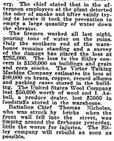 Four firemen were buried under a falling brick wall, two of them believed to have been seriously hurt, and thousands of dollars worth of property was destroyed in a spectacular fire at the two story brick warehouse of Bantivoglio & Son, junk dealers, 252 Division Street, at 9:00 o'clock this morning. The injured firemen attached to Engine Company No. 7, all of whom were taken to West Jersey Homeopathic Hospital, were: Captain Charles Watkin 45 years old, 927 North Front street. Four fractured ribs and a punctured lung. he may die. Nicholas Romaine, 43 years old, hoseman, 1271 Chase Street, lacerations of scalp and possible fracture of right ankle. Louis Quinton, 25 years old, hoseman, 626 Viola Street, probable fracture of right shoulder. Lester Anderson, 24 years old, hoseman, 1917 Niagara Road; lacerations of scalp and forehead and fractured left wrist. None of the four were able to walk when they were lifted from where they had been struck down by the falling bricks. They were carried to the police ambulance and hurried at once to the hospital. Residents of the neighborhood sat that a flash and a roar, as of an explosion, was their first warning of a blaze. The burned building has a frontage of 75 feet on Division Street. In a yard behind it there was a shed piled high with baled paper and three piled of used automobile tires. These caught fire and sent up black smoke that was visible for miles. Smoke Hampers Firemen A huge crowd of spectators already had gathered to watch the fire in this thickly populated section when the firemen arrived. The flames were threatening surrounding buildings, and the smoke was so dense that the men had difficulty finding their way out in the vicinity of the burning structure. Captain Watkins and the three other fire fighters started along a driveway beside the building with a length of hose which they intended to use on the blazing sheds in the rear. They were passing a window when there was a muffled roar and a blast of dense smoke blinded and confused them. By shouts to one another they heard that there number was still intact. The blast of black smoke had been caused by the collapse of a loft and the falling of several bales of paper. 100,000 Tires Burn More than 100,000 used automobile tires were destroyed in the blaze. The flames jumped a hundred feet into the air at one stage. Commissioner Hitchner watched the firemen at work from the roof of a nearby garage. When the blaze had been extinguished Mr. Hitchner left to visit the injured firemen in the hospital. He commended the four men on their bravery and wished them a speedy recovery. Quinton is driver for Battalion Chief Wade. The flames threatened to spread to the large garage of Louis Vananeri, on Spruce Street, directly in the rear of the junk yard. Firemen mounted the roof of this building and drove the flames back. Today's blaze was the fourth that had visited the warehouse this year. The fire today is believed to have been caused by spontaneous combustion. Carter Directs Rescue The quarter were stooping to take up their hose line again when there was a crack like the report of a pistol, followed by a terrific roar. Fire Chief Carter, personally directing his men, was about 50 feet away, and saw the four men buried as the bricks thudded down from the crumbling wall. "Come on boys, there are four men under here." the chief yelled, and soon a score of hands were tearing frantically at the heaps of hot brick. Bus Delays Ambulance The police ambulance in which the injured men were placed was delayed for five minutes on its way to the hospital by the refusal of a Public Service bus driver to give it the right of way. According to Policeman Howard Fisher, the busman was arrested. The police say he will be prosecuted to the full extent of the ordinance in such cases. The ambulance was forced to remain behind the bus for a block and a half, according to the reports. The pillar of smoke sent up by the blazing warehouse, sheds and 50-foot high piles of auto tires, drew thousands of spectators from all directions. Three alarms were turned in to the fire department in rapid succession. The police were called upon at once to establish lines for keeping back the crowd. Bales of paper stored in the main building, as well as in the shed behind, .absorbed tons of water poured into the place by the firemen's hose, and the added weight snapped off fire-weakened floor beams like burning matches. The falling timbers and masses of packed paper added to the danger and difficulty of the firemen's task. Only by a long and stubborn fight were the foremen able to prevent a conflagration among surrounding buildings. The big warehouse became a red hot furnace. The heat was so intense a half-hour after the fire was discovered that telephone ad electric light poles on the other side of Division Street were ignited. "Trouble crews" from the telephone and electric companies were rushed to the place to guard their wires against falling and injuring persons below. Loss placed at $50,000 It was roughly estimated that the the damage to the junk sheds and warehouse would reach $50,000. Mrs. Leona Brown, who had just moved today into the house at 264 Division Street , just east of the burned plant, was driven from her new home by the dense clouds of smoke from a blazing of automobile tires that towered above the west wall of her two-story dwelling. She was unable to return for any of her belongings when the flames began to eat their way through the west wall of her house. The fire was the second within a month in the junk yard, which is closely surrounded by frame residences, a frame negro church and other buildings on all sides. Romaine Seriously Hurt Hoseman romaine was reported by surgeons at the West Jersey Homeopathic Hospital as the most seriously hurt of the firemen caught by the falling wall. He was cut above the head, badly bruised about the back, and one of his ankles is believed to have been fractured. Captain Watkins 