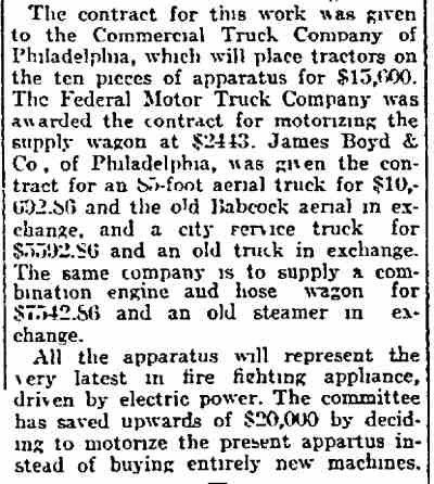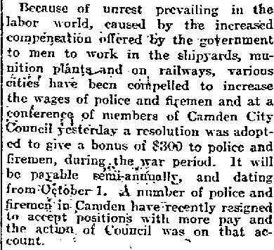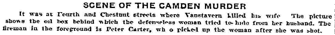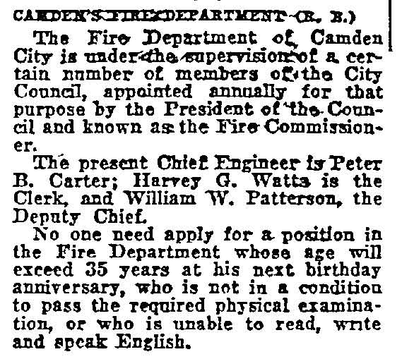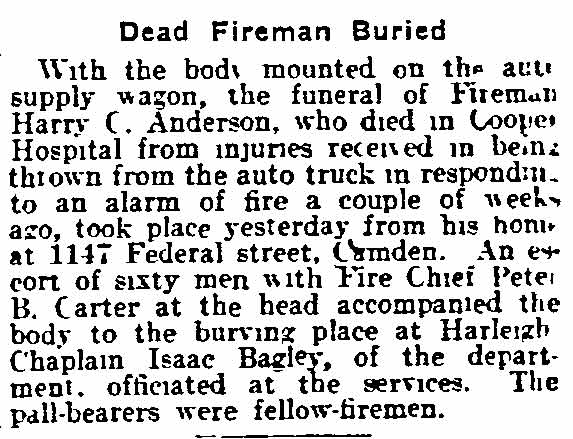 CHIEF’S REMAINS Not since the memorable funeral of Chief of Police Foster ten years ago, has there been such a genuine public tribute paid an official of Camden as was in evidence last night at the bier of the lamented Fire Chief Worthington, and today at his funeral. It is hard to estimate the number of persons in a crowd, but from 7 until 9 o’clock last night there was a steady stream of men, women and children, two abreast, who passed from the main entrance, through the center corridor and beneath the illuminated rotunda, where the body lay, and thence out by the west corridor. There was never a stop, and it is estimated that at least 10,000 persons were there, perhaps more. There could not have been a more ideal location for the repose of the casket containing the honored dead, and the great array of beautiful flowers than beneath the rotunda. It seemed to be a sacred shrine in itself where the citizenry dropped a tear for the lamented departed. The effulgence of the soft lights from above specially installed by Electrical Chief Kelly but lent to the scene and as the dark garbed escort of firemen, the active pall bearers, stood, on guard, the scene was unusually impressive. Chief Worthington, aside from the pallor that comes to the dead, looked as he did in life, for the thread had been snapped so quickly that it was while he was in his full vigor that the vital spark had taken its flight. There were some marks on his face that indicated the intense though momentary suffering through which he passed on his fateful plunge from the roof of the burning building to his quick death, and the passing crowd remarked this. But withal there was that calmness and repose feature which seemed to indicate that the gallant leader of Camden's fire fighters but lay sleeping rather than that his soul had taken its eternal flight. Public grief may be a mere ephemeral emotion, born of the moment and only to be succeeded by the acclaim of the newly arisen public idol, but last night's encomiums seemed to come from hearts that overflowed with genuine and permanent sorrow over the untimely passing of so excellent a public servant. Many tear-suffused eyes indicated this, many expressions of grief, of sorrow, of condolence of those left showed this. The sentiment in evidence everywhere can only be likened to the sweetness of the wonderful flowers whose odor spread thorough all the corridors and in all the rooms of the great marble building. High in the clock tower of the City Hall the bell began tolling at 6:30 o'clock. At half-minute intervals its doleful strains went forth on the cold blustery east wind which had succeeded at day of spring sunshine. The bell and the screeching wind seemed to combine as a knell indicating the passing grief of the city. It was the preliminaries to the marching of the funeral cortege from the stricken Chief's home on Penn Street to the resting place at the Court House. There were forty policemen in dress uniform with Chief Gravenor at their head. There were twenty-six fire heads from Philadelphia, with Chief William Murphy in the van, a tribute in itself of more than passing moment. There was the caisson on which was the black draped casket containing the body of he who all honored. There was the little red car in which Chief Worthington was wont to speed through the city at every alarm and there was his helmet and coat. There was Acting Chief Stockton and forty of the men who fought flames under the direction of he who lay so still. There as the family in cabs with curtains drawn, the members of City Council and the active pall bearers- Daniel Leach, Peter B. Carter, james white, William Patterson, Elmer Burkett, Samuel Harring. When the cortege reached the Court House the Camden boys took up their position on the inside beneath rotunda while the Philadelphia visitors made an imposing array on the granite steps outside. And then came the public in its steady and unending stream. Later the Philadelphia delegation was escorted to the Board of Freeholders room where tribute was paid to the dead and where a mingling of the two cities took place. Besides Chief Murphy the visitors included Battalion Chiefs William T. Barrett and George P. McConaghy, Captains L. F. Bunting, William Lindsey; H. Dinlocker, J. Higginson, J. E. Talbot, D. Campbell, T. O'Brien, F. Hughes, E. Basenfelder; H. Hutt, William McCusker, G. Rheim, R. Wilsey, J. Webb, H. Goers, H. Haines, Insurance Patrol Captain Joseph H. Shermer William Hickman, William Rodgers, John Wyatt, David Phillip, John Clyde, H. Wilkinson. President of City Council James E. Hewitt spoke of the work Chief Worthington had already accomplished, of his plans, of his value and worth to Camden. Chief Murphy responded in a fitting way and this incident in itself was one to be remembered. An affecting sight was witnessed by the handful of spectators, among them being other firemen, city and county officials and policemen who remained after the big doors on Sixth Street had been closed. The last to view the Chief's remains were a delegation of about twenty firemen. Solemnly the men passed by the bier and gazed upon the features of their departed brother. As the last of the line approached Deputy Chief John A. Stockton was seen. He stopped and with his cap laid across his breast be looked down into the casket. For almost a minute Chief Stockton stood as though glued to the spot. Then he glanced about him and the sympathetic look upon his face thrilled all. He heaved a sigh and perhaps the teardrops refused to come, but Chief Stockton, as the lines upon his face showed, was struggling with the inner man. His emotions were tugging at his heart, but a fire laddie cannot give way to his feelings although his brother superior officer and dear friend had answered his last alarm. The floral pieces surrounding the bier bespoke the love, admiration and respect the donors held for the dead chief. One design particularly beautiful was a mammoth loving