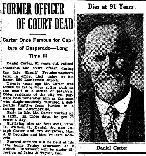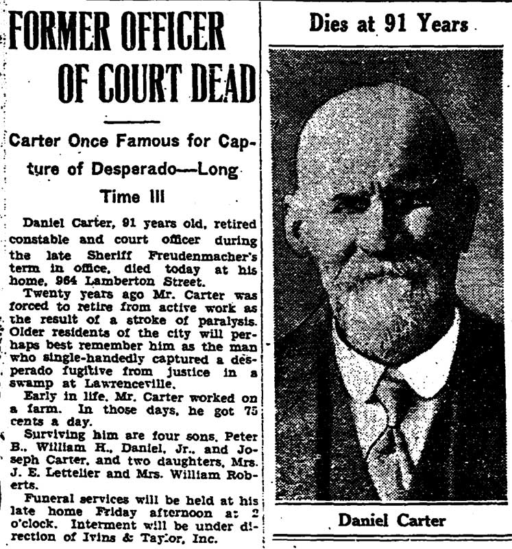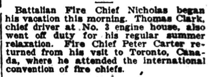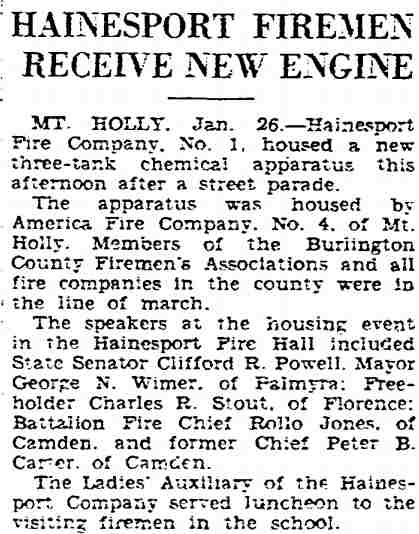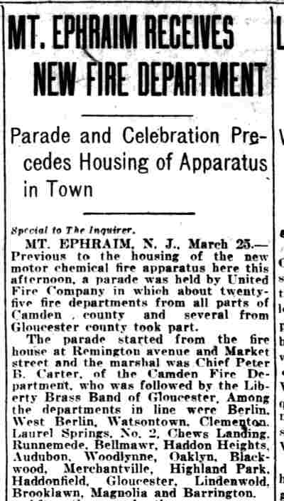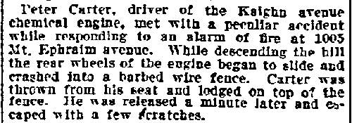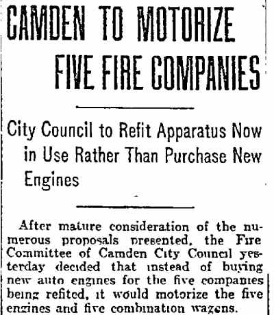 Alarms of Fire Before and After Carrigan Funeral Just before Camden firemen were planning to leave headquarters yesterday to march to the home of Captain martin b. carrigan, who lost his life in the falling roof at the Economy Store fire, they were summoned to a three alarm fire at the stables of Hugh A. Greenan, 1736 South 7th Street. When Engine Companies No. 7 and 8 reached their fire houses this morning after the Carrigan funeral, an alarm was received from the drugstore of W.J. Grobiowski, 1250 Everett street. The Grobowski fire had its origin in a pile of rubbish in the basement and was extinguished with a small loss. |