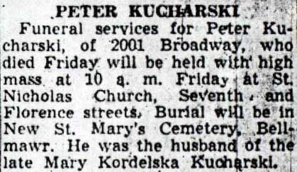 PETER KUCHARSKI was born in the Ukraine, then a part of the Russian Empire, around 1879. With his wife Mary he came to America in 1903, and settled in Camden's 8th Ward, which had a sizeable Ukrainian community, which soon banded together to build St. Nicholas Church at 7th and Florence Street, which was renamed St. Michaels Ukrainian Catholic Church in the 1940s. St. Michael's congregation moved to Cooper Landing Road in Cherry Hill NJ in the 1970s. At the time of the 1930 Census he was a widower, and was living above the bar at 2001 Broadway, known in modern times as the Belleview Inn. The proprietor of the bar was Peter Koszarecki (spelled in some places as Koszaraska). Peter Kucharski was at the time of the census working as a presser in a clothing factory. He apparently became the proprietor of the tavern at 699 Central Avenue shortly after the census, and had an ongoing business relationship with Peter Koszarecki. Peter Kucharski lived the rest of his days above the Belleview Inn. at 2001 Broadway. He passed away on November 29, 1940. After services at St. Nicholas Church he was buried at New St. Mary's Cemetery in Bellmawr NJ. In June of 1939 the Camden Courier-Post reported that a Peter Kucharski received a liquor license renewal for the bar at 699 Central Avenue. However, it is known that several years prior to his death the Koszarecki family obtained an interest in the property, with daughter Sophie and her husband Nick Domenices-Del Grande working at the establishment. Sophie's obituary indicates that she had an ownership interest in the bar as early as 1934. As Peter Kucharski is listed as the proprietor in the 1940 Camden City Directory, this appears to be the case. The next directory was published in 1943, and shows that a Mrs. Catherine Kucharski was the proprietress of the establishment. As of this writing (November 2003) it is unclear precisely who this person was. However, given the dates of the documents and in hand and Peter Kucharski's relationship with the ownership at the nearby Belleview Inn, it is a possibility that she was a relation to the Koszarecki family. By 1946 title to the bar had passed to Nick and Sophie Domenices-Del Grande, and this bar has been popularly known as Nick & Sophie's Tavern ever since. As Sophie Domenices was the daughter of Peter Koszarecki, Peter Kucharski's landlord, it seems to indicate that Kucharski had an interest in 699 Central Avenue in the years before his passing. Sophie's obituary indicates that she had an ownership interest in the bar as early as 1934, and this seems to confirm the theory. |
