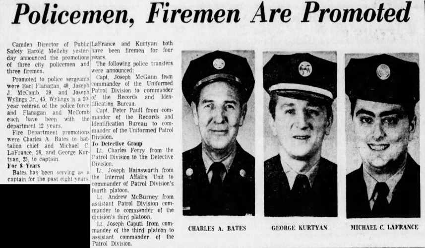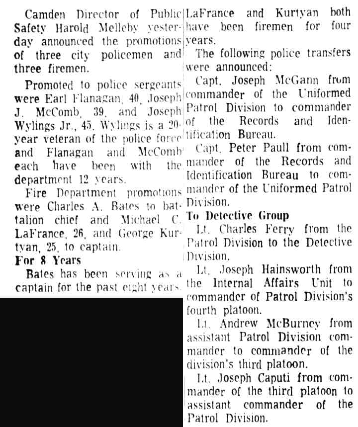 9 Camden Police Earn Promotions Lt. Howard Clayton, 55, 30 year veteran on Camden's police was named acting captain of the service division yesterday, while five city patrolmen were sworn in as detectives by John T. Odorisio, city clerk. A sixth patrolman, isaiah pitts, 37, of 2920 Berkley Street, unable to attend promotion ceremonies because of illness, will be sworn in on return to duty. He's a 10-year veteran. As acting captain of the service division, Clayton will head the identification, traffic and communications bureaus. Patrolmen promoted yesterday were Augustus Balzano, 31, 3165 Merriel Avenue, and David Del Rossi, 27, 1466 Mount Ephraim Avenue, both three year veterans; John Phoenix; 35, 1333 Princess Avenue, Robert Mentz, 30, 2608 Baird Avenue, and Gilbert Upshaw, 36, 1525 Wildwood Avenue, all six-year members of the force. The six men will earn $6625 a year as detectives; a $200 increase in present salary. All have been acting as detectives. Deputy Police Chief william yeager also announced the appointment of sgt. Peter Paull, 42, a 16-year man on the force, as acting lieutenant. Paull will be in charge of the communications section. Frank Senatore, also 42, and an 18-year veteran, will be transferred from the patrol division to the detective division Monday morning, Yeager said . Present during the swearing in were Police Chief Harold Melleby, yeager, and Captain John Watkins, head of the detective division.. |