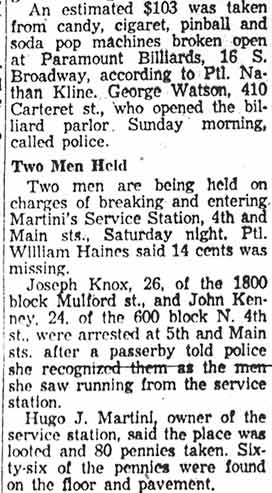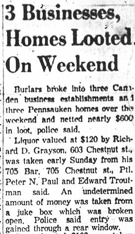 - Nathan Kline William Haines - 705 Bar - Martini's Service Station Paramount Billiard - George Watson - Hugh Martin Richard D. Grayson - broadway - Carteret Street Chestnut Street - Main Street Mulford Street - North 4th Street - North 5th Street |