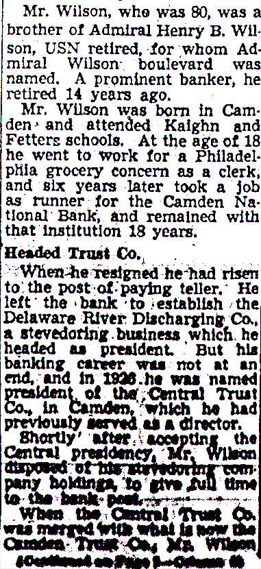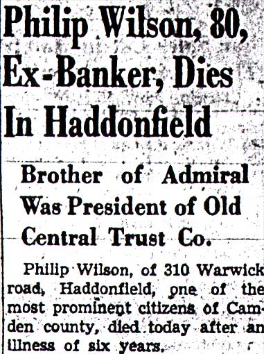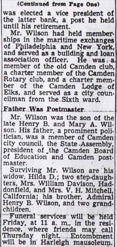 FUNERAL OF MRS. WILSON BEING HELD TOMORROW Funeral services for Mrs. Emma Foulon Wilson, 50, wife of Philip Wilson; vice president, of the Camden Safe Deposit and Trust Company, who died Wednesday, will take place at 2 p.m. tomorrow, at the mausoleum in Harleigh Cemetery. Wilson formerly was president of the central trust company and the Delaware River Discharging Company. He is a brother of Admiral Henry B. Wilson, former commandant of the Annapolis Naval Academy, and resides at 230 West Summit Avenue, Haddonfield. |