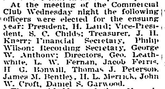 Knerr - George W. Anthony George Leathwhite - L.W. Ferna - Jacob Ferris - H.G. Bonwill Thomas J. Peterson - James M. bentley - H.L. Merrick John W. Croft - Daniel S. Garwood - Philip Wilson Commercial Club |