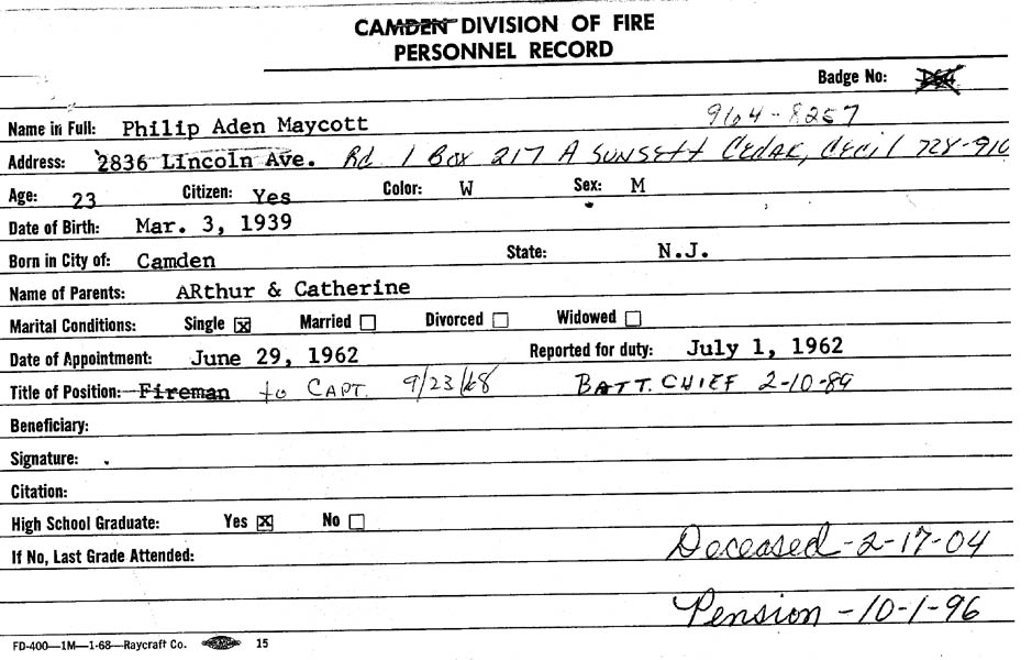 PHILIP A. MAYCOTT was born in Camden, New Jersey on March 3, 1939 to Arthur and Catherine Maycott. The family lived at 1921 River Avenue in Camden's Cramer Hill neighborhood when the 1947 City Directory was compiled. Philip Maycott was appointed to the Camden Fire Department on June 29, 1962. He was then living at 1023 North 32nd Street. He reported for duty on July 1, 1962, and was promoted to Captain on September 23, 1968. Fire Department records state that he lived at 2836 Lincoln Avenue in Cramer Hill. On March 30, 1970 Captain Maycott was one of five Camden firefighters injured while fighting the fire at the General Radio Supply Company building at 600 Penn Street, when the building collapsed on top of them. Although the results might have been disastrous, all five men survived, despite being trapped beneath tons of rubble. Philip Maycott returned to active duty in short order and was promoted to battalion Chief on February 10, 1989. He retired on October 1, 1996. After residing for most of his life in Cramer Hill, Philip Maycott moved to Cecil, New Jersey and then split time between Brigantine at the New Jersey seashore and Cape Coral, Florida. He passed away on February 17, 2004. |