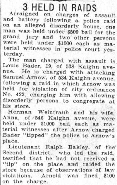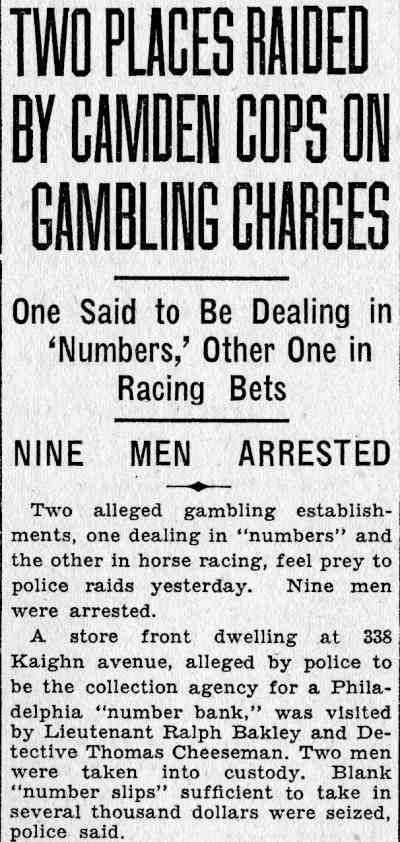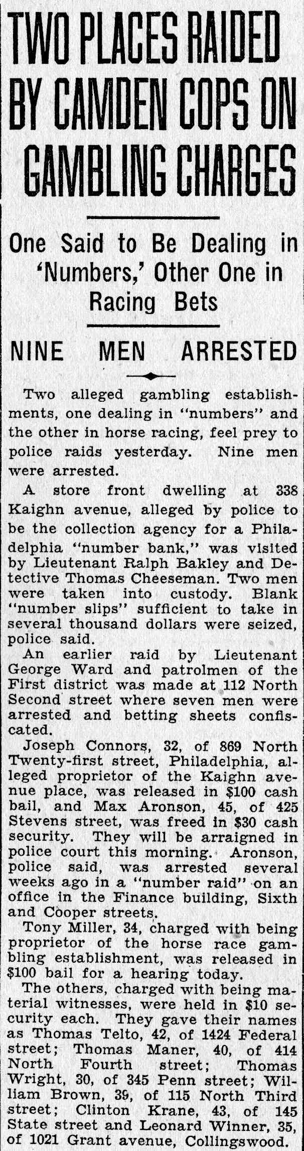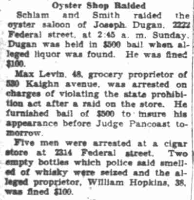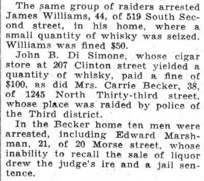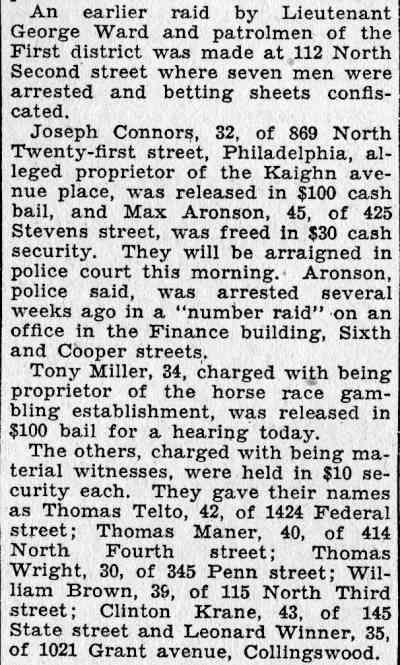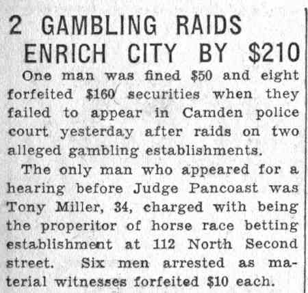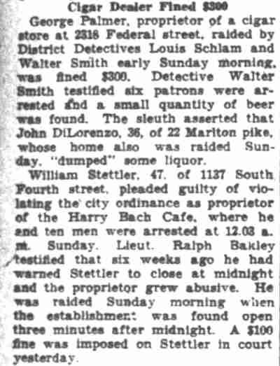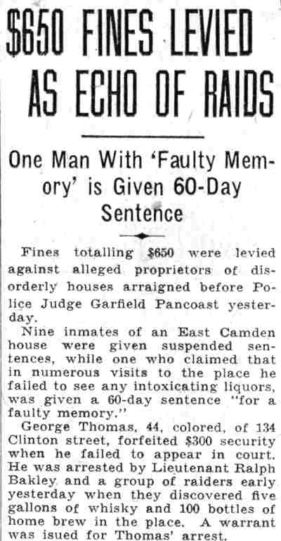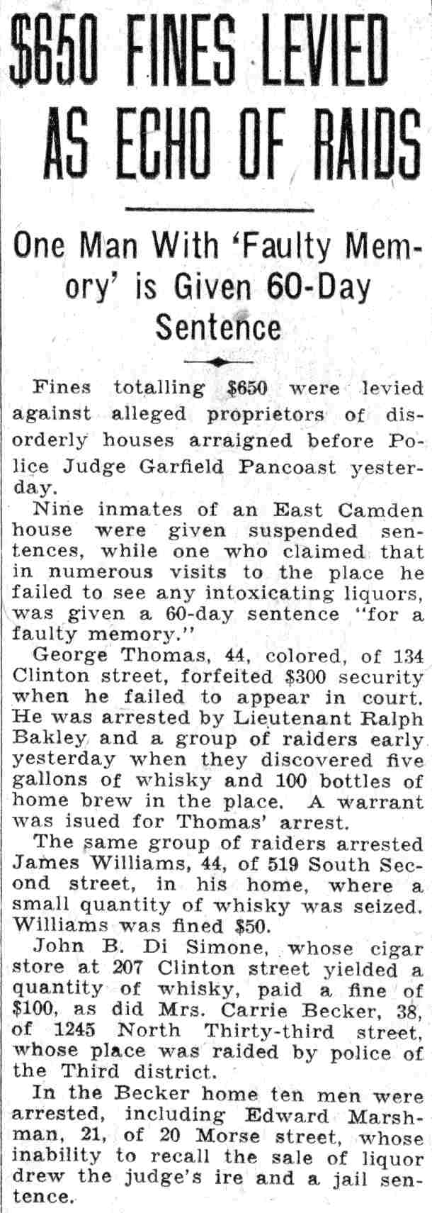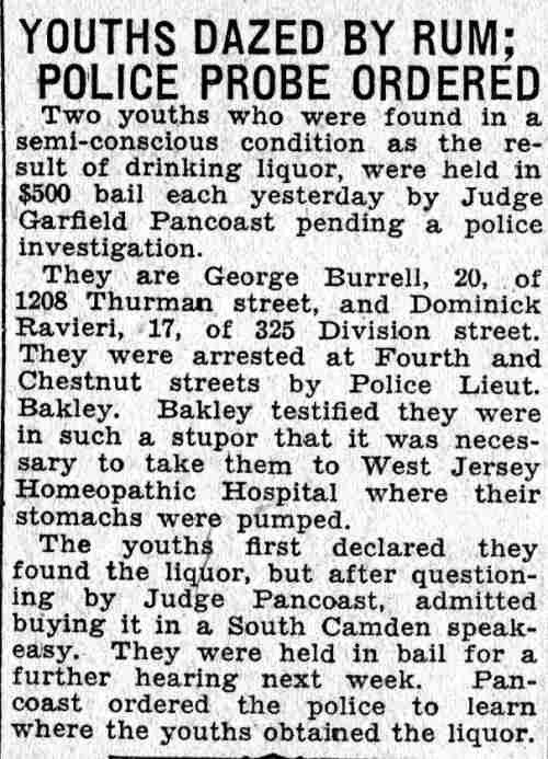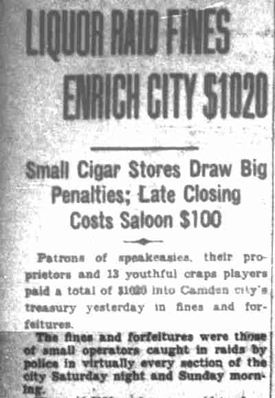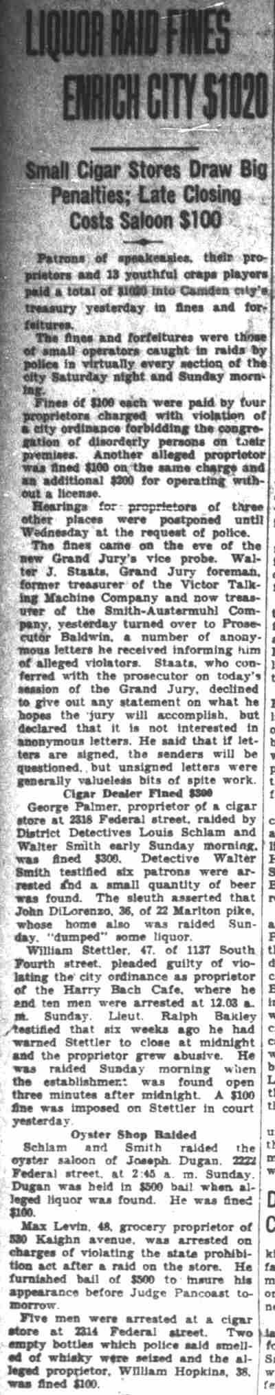 Two excuses offered by two men for the presence of beer in their stores failed to impress Police Judge Pancoast yesterday. One storekeeper went to jail for 30 days in default of a $50 fine and the other storekeeper was fined $200. Charles Yatzus, 43, of 1036 Central Avenue, went to jail because he was unable to explain how he was able to purchase beer and whiskey when he was on the verge of becoming a charge of the city emergency relief administration. After Lieutenant ralph bakley had testified beer and whisky were found in his store, Yatzus said he was expecting friends from Wilmington and had purchased the liquor for use while they were at his house. Then he said he didn't have any money and was running a small store to keep from becoming an emergency relief charge. Angelo Teto, 42, of 1024 South Third Street, insisted Earl Foy, 1016 South Sixth Street, came into his store to buy a bottle of root beer and not 3.2 beer. Foy, who said he was directed by Lieutenant Bakley to make a "buy" of beer at Teto's store, testified Teto told, his 11 year-old daughter to get a bottle of beer from the ice box. Before the deal could be completed, Foy said, Detective Vernon Jones entered the store. Foy said Teto ordered his daughter to return the beer to the icebox, saying he recognized jones . The beer, Teto said, was purchased for his own use. Teto insisted that Foy had asked for root beer and was to be served root beer. Judge pancoast said he did not believe Teto's excuse and fined him $200. Because he refused to follow the friendly advice of a policeman and "go home to sober up," Louis Schechtman, 48, of 2374 Broadway, is in the county jail today, beginning a 60-day sentence, in addition to pay-ing a $25 fine. He faces another hearing tomorrow on charges of selling beer illegally. schechtman , according to Motorcycle Policeman George Jefferis, was creating a disturbance at broadway and Fairview Street yesterday. He became abusive when told, to "go home and sober up," Jefferis said, so he went to jail. Judge Pancoast sentenced him to 60 days on the charge of being intoxicated. Robert Powell, 430 Stevens Street, a taxicab driver, filed a charge of disorderly conduct against schechtman , alleging schechtman refused to pay a taxicab bill of $12.35. The disorderly charge brought a fine of $25. Lieutenant Ralph Bakley alleged schechtman had been violating the temporary beer law of New Jersey by selling beer without a license. Judge Pancoast said schechtman will be taken into court tomorrow morning for a hearing on the beer charge. |