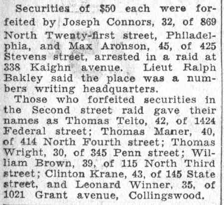 33rd Street - Harry E. Renders - Charles Luers North 2nd Street - George W. Rush - Farragut Avenue - Watson Street Joseph Benson - Charles Benson - Edward Marshman - Morse Street John Grogan - North 22nd Street - Charles Dudley - North 3rd Street Ralph Bakley - Vernon Jones - Thomas Cheeseman - Marshall Thompson George Thomas - Clinton Street - James Williams - South 2nd Street John B. Simons - Samuel Aronow - Kaighn Avenue |