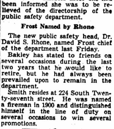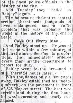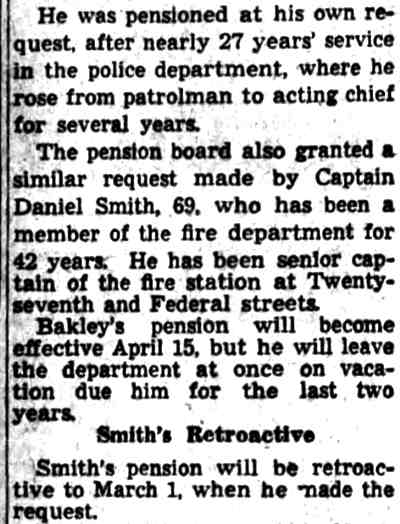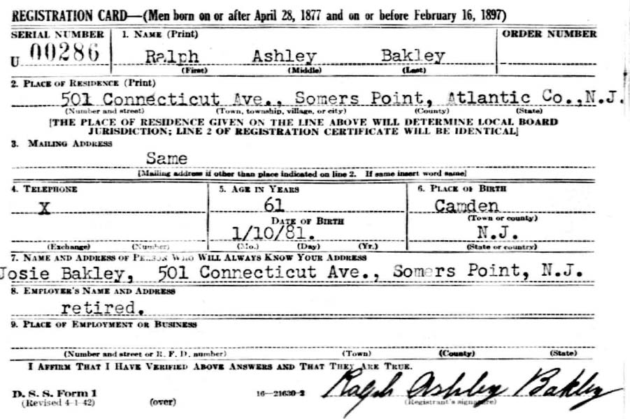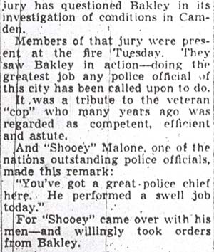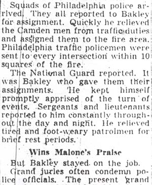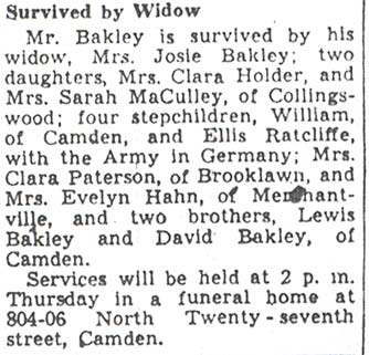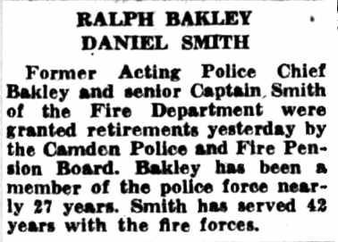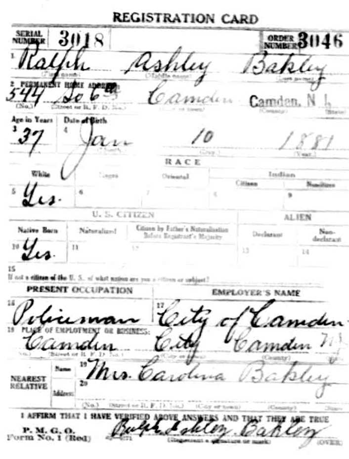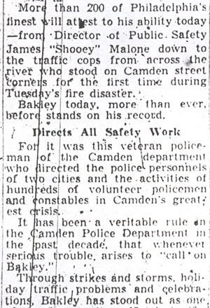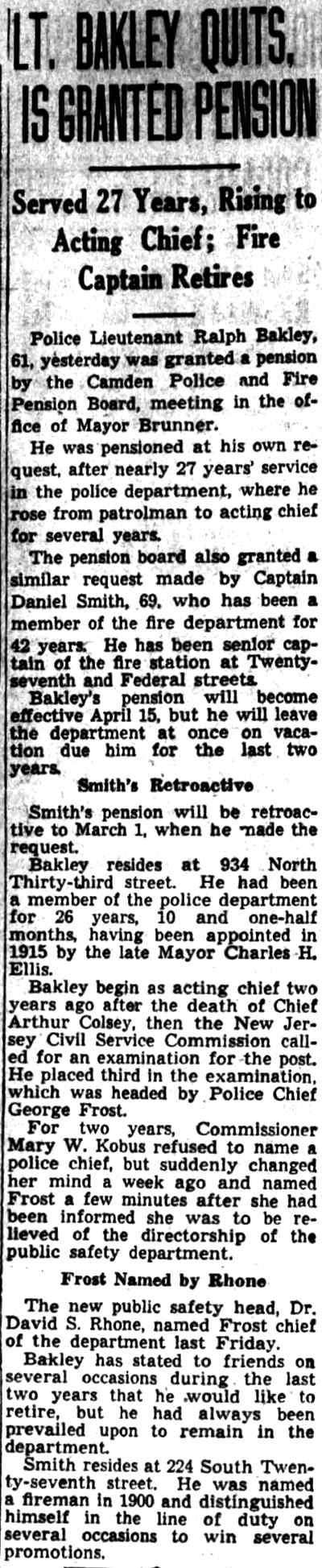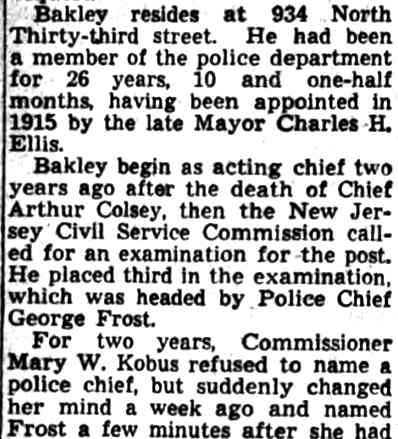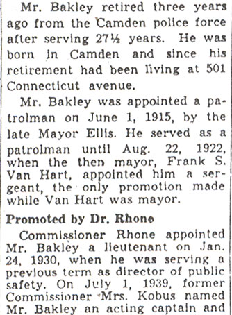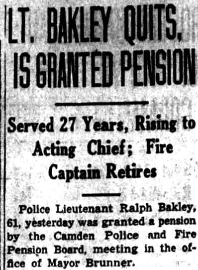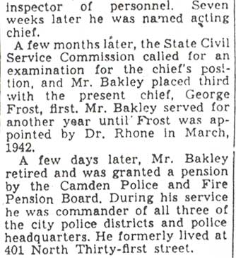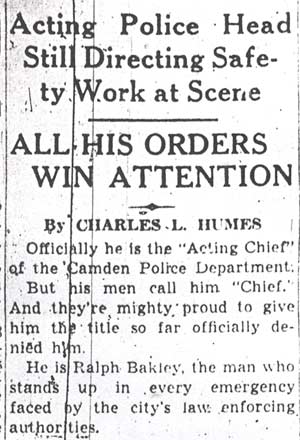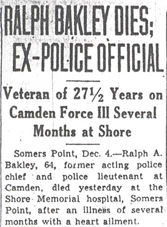 RALPH A. BAKLEY was born in New Jersey on January 10, 1881 to Clara and Ridgeway Bakley. He was the youngest of three sons, being born after Lewis and David Bakley. The family was living on York Street just before he was born. They had moved to 213 North 9th Street by 1887, and by 1890 to 582 Pine Street. When the Census was taken in 1900 the family lived at 583 South 6th Street. The elder Bakley then worked as a day laborer. Ralph Bakley grew up and remained in this neighborhood through at least 1929. As a young man Ralph Bakley was well known locally as an athlete, excelling in baseball and basketball. In a column published in the Camden Courier-Post, Dan McConnell wrote in November, 1939: "This department has been advised by Lewis A. Lee, chief clerk of the city health bureau, that Winfield Clark, aide to Frank B. Luker, was in error when he gave the names of several players on the old Camden Wheelmen baseball team. Mr. Lee says those guys played on the Camden City team, Lew admitting that he covered first base for the Wheelmen. And he also told us that Acting Police Chief Ralph Bakley once aspired to be a professional pugilist, but he gave up that idea when another fighter gave him a fistic shellacking in a scrap at the old Globe A. C. in Philadelphia many years ago. Bakley was a stellar outfielder in his younger days. Mr. Lee informed us. We can say that Bakley has done a fine job as one of the better liked police executives of Our Town." Ralph Bakley was married in 1903 to Caroline, also known as "Carrie". The 1906 City Directory lists Ralph Bakley at 641 Line Street, working as a metalworker. 1910 Census and 1914 Directory lists Ralph Bakley at the same address with his wife Carrie. No children by 1910. He was then a foreman. A court officer, W. Frank Garrison lived just two doors down, and may have, in time, helped Ralph Bakley secure his appointment to the police department. A daughter, Clara Bakley was born around 1912. On June 1, 1915 Ralph Bakley was appointed to the Camden Police force by Mayor Charles Ellis. In 1916 another child, Sarah Bakley, was born. When he registered for the draft in September of 1918, Ralph Bakley was living at 544 South 6th Street. By 1920 and through at least 1924 he and his family lived at 542 South 6th Street. Sadly it appears that Carrie Bakley died around 1926, leaving Ralph Bakley to take care of his two daughters. The 1927 and 1929 City Directories show that he had relocated to 602 Clinton Street. The 1930 Census shows that he, his daughters and his widowed mother were at that address. Ralph Bakley did in time, however remarry. The 1920s were good professionally to Ralph Bakley. He was promoted to Sergeant in 1922 by then-Mayor Frank S. Van Hart, and at the end of the decade he was in line for a promotion to Lieutenant, which came through in January of 1930 from the office of Commissioner Dr. David S. Rhone. On July 1, 1939 Commissioner Mary Walsh Kobus promoted Ralph Bakley to the rank of Acting Captain. Unexpectedly, Chief of Police Arthur Colsey died in his sleep of a heart attack on September 15, 1939. He was buried at Arlington Cemetery in Pennsauken NJ on September 18, 1939. Captain Ralph Bakley was named Acting Chief of Police a few days later by Commissioner Mary Kobus, Camden's Director of Public Safety. A few months later, the New Jersey State Civil Service Commission called for a test for the Chief's position. Ralph Bakley scored third, with George Frost getting the top score. Chief Bakley continued to serve in the position of Acting Chief until March of 1942, when Chief Frost was confirmed in the position. Ralph Bakley retired few days later. Acting Chief Bakley had lived in the 1930s and 1940s with his second wife, Josie, on North 31st Street. Upon retirement he moved to Somers Point, New Jersey, where he died in December of 1945. |