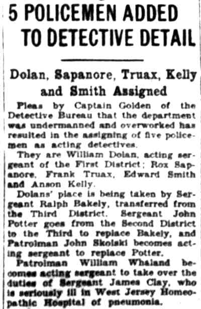 “I want 100% efficient police department and not a political machine.” Commissioner Mary W. Kobus, new director of public safety, made that declaration yesterday afternoon at a joint police-press conference in her office at city hall before she was served with a writ restraining her from taking that office. Commissioner Kobus was the kindly mother talking to her “boys” for the most of the conference- but at times she became the stern parent- with the birchrod in the cupboard- as she instructed the police heads to “divorce themselves from politics.” “For many years I have nursed in my heart a desire to see Camden with a 100% efficient police department”, the commissioner said. “Now that time is at hand.” “I have known all of you men for many years,” she told the assembled commanders, “and I don’t care what your respective political affiliations might be. You have a right to you opinions, but I want the police department to divorce itself from politics. . “You must know what is going on in your city and you must let me know. I must have 100 percent cooperation if I am to succeed in this new undertaking. “If you have any complaints, don’t go around and growl, undermining the department. Lay your cards on the table, I guarantee you a fair deal. “Chief colsey is head of the police department and not in name only. You others in the rank you occupy are also commanders in fact and not in name. It is up to you.” The commissioner urged a closer co-operation between police and the press and concluded by saying she wanted her “family” to be honest-to-goodness policemen “because there is no room in the department for those who are not.” Attending the conference was Chief Arthur Colsey, Lieutenant Herbert Anderson, chief clerk of the bureau; Lieutenants George Frost, ralph bakley, Walter Welch, Samuel E. Johnson and George Ward. |