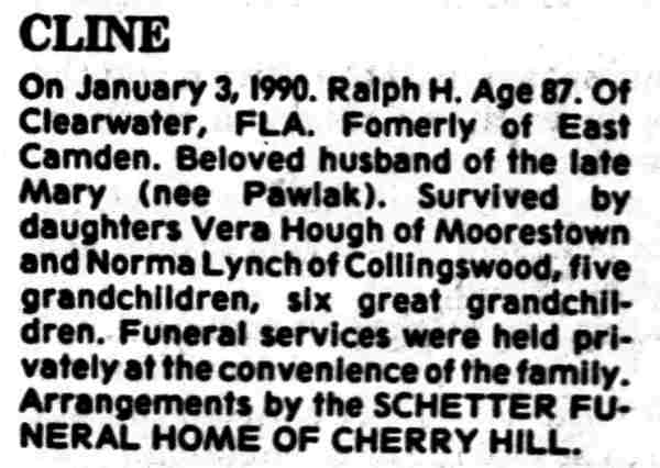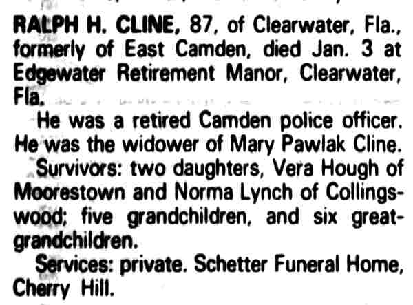 RALPH H. CLINE was born in New Jersey on May 27, 1902 to William and Viola Cline. He joined the Camden Police Department on July 1, 1928 along with Joseph Mardino, John Kaighn, and William Stibi. When the census was taken in April of 1930, he was living in a house that he owned at 379 North 33rd Street in East Camden, with his wife, the former Stephanna Pawlak, daughters Vera and Norma, and sister-in-law Edna Pawlak. Ralph Cline was still serving on the force as late as December, 1957, and still resided on North 33rd Street as late as 1956. By 1959 he had moved to 416 North 41st Street, where he resided for many years before finally moving to Wildwood NJ. He later moved to Clearwater, Florida where he passed away on January 9, 1990. |