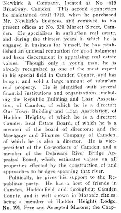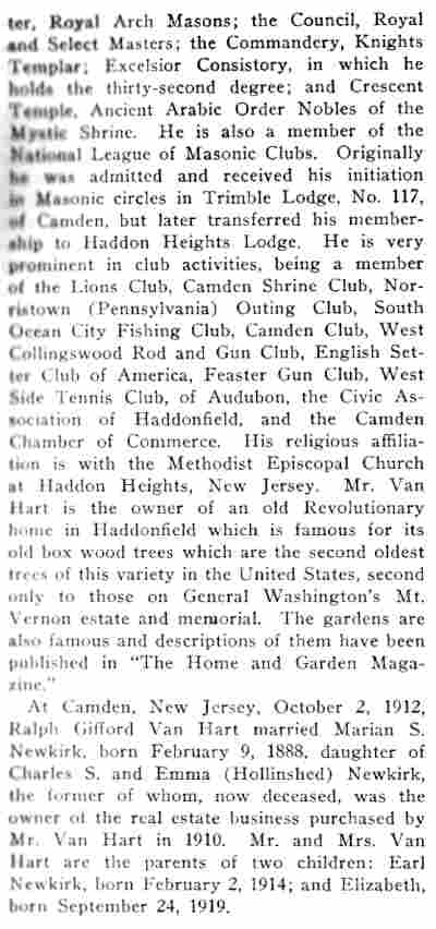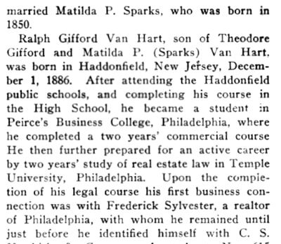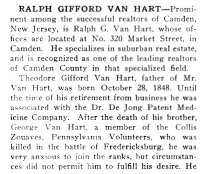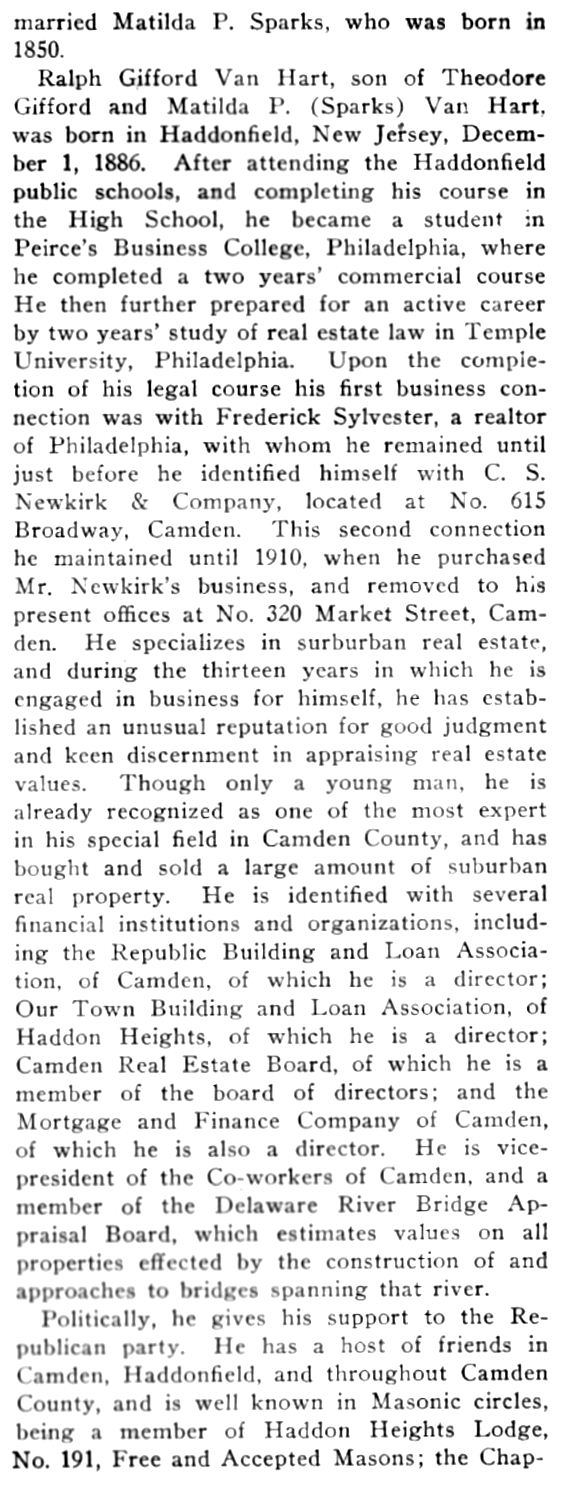 RALPH GIFFORD VAN HART was a prominent realtor with offices in Camden in the 1910s and 1920s, having worked for and succeeded in business Charles S. Newkirk. Frank Van Hart does not appear as of this writing to have been related to Frank S. Van Hart, Mayor of Camden in 1922 and 1923. |