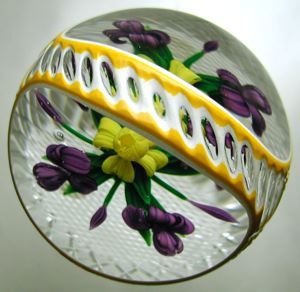Glassworking was not Ray's first occupation. Born in Camden, New Jersey, in 1918, Ray worked as a fireman from 1946 until 1973. Ray married his wife Ruth in 1948. In 1951, they had a son, Robert. The witty Ruth not only brought her clever sense of humor to the marriage, but also her inherited love of glass and antiques. Like a sponge, Ray began to read and meet antique dealers, soaking up knowledge about glass and other precious objects. He also met old-time South Jersey glassblowers. Ray became a well-informed dealer of art glass and antique paperweights. His love of antique paperweights led him to discover the works of other early lampwork paperweight makers. About this time, Ray's son Bob was graduating from high school. As a present, Ray and Ruth gave Bob a propane and oxygen burner used to melt glass rod. Unable to resist, Ray began to experiment with the burner, eventually resulting in a line of small paperweight pendants and miniature buttons. Like so many of the early lampwork artists, Ray and Bob pursued all avenues to find suitable and compatible glass. After three years of struggles, Ray's own style of weights began to emerge. Ray and Bob both developed their own paperweights while working closely in their shared studio in the garage of their home. They worked together experimenting with techniques but each creating his own unique style. Ray is known primarily for two types of flowers he developed. He is famous for his many types of roses. Single roses and bouquets in a wide range of colors and shadings. He and Bob also developed a way to overlay the paperweights with color. The pieces later being cut with various windows. Perhaps the single piece for which the Banfords are most known is a basket-cut overlay with either rose or iris bouquets contained therein. Also made were clear baskets, the cutting done by master glass cutter Ed Poore. The other type of flower weights Ray is known for is the iris. From magnum-sized bouquets to a small single flower, he has created an abundance of different designs. He, along with son Bob, also create collaborative pieces, though very few. Now Ray has cut back on his paperweight making, creating no more than 15 weights a year. He takes pleasure in reminiscing about the early days of lampwork paperweight making and the friends he has made. Sharing his love of glass and paperweights with his family and associates is still an important part of Ray's life. After more than twenty years, Ray Banford's influence on paperweights has been enormous. Although he will eventually retire, the legacy of paperweights he leaves behind insures he will never be forgotten. Ray's paperweights are in numerous public and private collections; among them are: