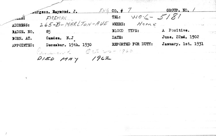 RAYMOND J. BURGESS was born in Camden on June 22, 1902 to Elsie and Marcellus Leroy Burgess. His father worked as a blacksmith. The 1910 Census shows the family, which included sons Leroy and Harold, at 620 Walnut Street. Raymond Burgess was working for the American Ice Company in January of 1917 when he and five other men, including George Clayton and Robert Knox, took part in rescuing a skater who had fallen through the ice at a lake in the Kirkwood section of Voorhees Township. One of the other men, George Clayton, was appointed to the Camden Police Department in 1918; another, Robert Knox, joined the Camden Fire department the same year. The Burgess family was living at 710 Mount Vernon Street in 1918, when the elder Burgess worked at New York Shipbuilding Corporation's shipyards. Although not old enough to have to register for the draft, Raymond Burgess enlisted in the United States military during World War I, and was still on active duty when the Census was taken in January of 1920. His family had by then moved across he street to 721 Mount Vernon Street by January of 1920. The Burgess family, which included son Leroy Jr., lived at 764 Line Street as late as 1924. Raymond Burgess married at the age of 21. The 1927 and 1929 City Directories show Raymond Burgess living with wife Helen at 515 South 7th Street and working as a machinist. The April 1930 Census shows them with two daughters, Helen and Marguerite. The Burgess family was still living at 515 South 7th Street when the 1940 Camden City Directory was compiled. Raymond Burgess was appointed to the Camden Fire Department on December 19, 1930. He reported for duty on January 1, 1931. Raymond Burgess served with Engine Company 7 on Kaighn Avenue in the mid 1930s. The 1943 and 1947 Camden City Directories show the Burgess family living at 1272 Sayrs Avenue. By 1959 Raymond J. Burgess had moved to 265 Marlton Avenue. Raymond J. Burgess served for over 29 years, retiring on pension on October 22, 1960. He died in May of 1962. |