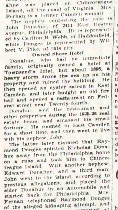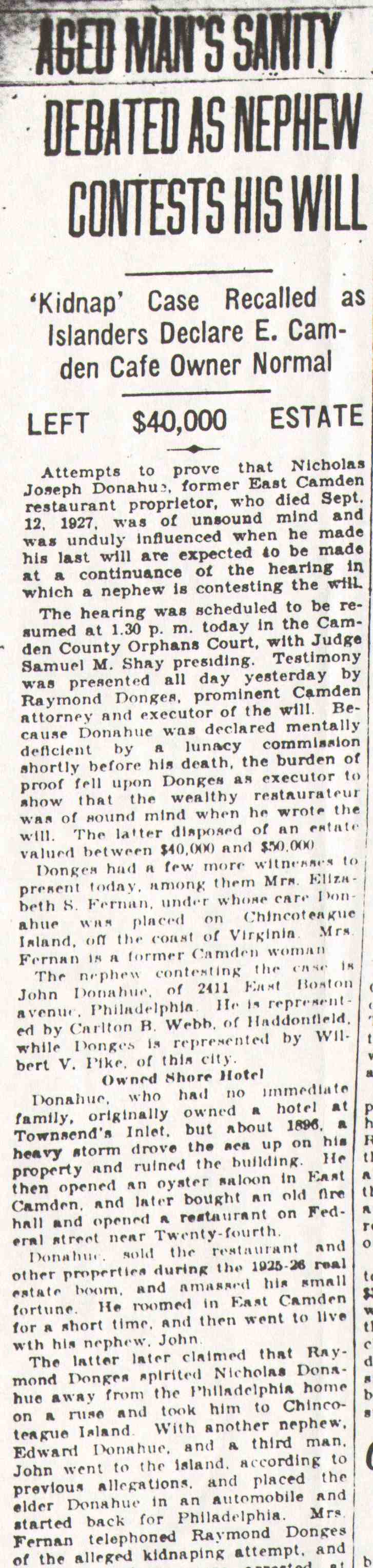 Old Centreville Families WHEN a larger community annexes an adjoining district the newer area is generally regarded, for a time at least, as a step-child. Older residents of East Camden will bear out that truism when they recall how difficult it was to obtain improvements. Years before, Newton Township which became part of Camden, had had the same experience. Under such circumstances, it requires tireless energy on the part of leading men to get what their district needs. Demands often go unheeded unless the community is fortunate in having those of spirit who insist on street improvements, water extension, lighting facilities and schools. That was more in evidence half a century ago than now, of course, for Camden itself was little more than a large village. Down in Centreville there were men who looked after the interests of their constituents, who slowly but surely obtained, improvements and who insisted on being recognized by the powers that be. No one may think of old Centreville without thought of Dr. John W. Donges, whose value to not only that section but Camden at large, has been expatiated upon in these annals. He was not only a leading physician, with a practice extending into Camden, but a leader in many civic movements, and any article on that era would be incomplete without allusion again to the doctor whose services as a real family physician are part of the traditions of many old families. Came Here In 1872 He came here in 1872 from Schuylkill County, Pennsylvania, when his health was affected by overwork through loyalty to his patients. He bought the drugstore at Ferry Avenue and Broadway, remaining there for many years. It was there Supreme Court Justice Ralph W. E. Donges spent his boyhood. There, too, Dr. Clarence B. Donges and Attorney Raymond Donges were boys. Grant E. Kirk, clerk in his store, later becoming a physician and for several years a member of council and at one time being prominently boomed for mayor, married their sister. Dr. Donges was elected to council in 1878 on the Democratic ticket, itself an evidence of the high regard in which he was held, for the Eighth Ward generally was rock-ribbed Republican. Until the early part of this century he resided in his old place, but later went to broadway and Clinton Streets. In later years, after he had retired, he was city assessor, "just to keep busy." He died a few years ago, well in his 80s, mourned by a great host of Camdenites. There was another widely known Centreville family of the old days, that of Samuel Mills, who had his own abattoir at broadway and Jackson Street, where city-dressed meats were provided before the days of car refrigeration brought supplies from the great packing places in Chicago. His son, Charlie, was long a member of the Board of Education, while another, William, was a city councilman. Edward Milis, another son, was excise commissioner 35 years ago in the days when there was plenty of trouble with Sunday sellers. Cornelius Schepperkotter was a factor in politics down that way, too, having a grocery store on ferry avenue at Ninth, later moving to the southwest corner when the Charles Sumner School was built. That school was torn down two years ago for the recreation center. Schepperkotter was a member of the old Board of Public Instruction in the late 90's, named by Mayor Cooper B. Hatch. In later years and until his death, he was superintendent of Evergreen Cemetery. He was father of Mrs. Frank S. Albright, wife of City Clerk Albright. Frank Covely Shortly after the New York shipyard was opened, there moved to the "Hill" Frank D. L. Covely, who became a joiner and for years was foreman of the joiner shop. He was widely known as a secret society man and also as an effective campaign speaker for the G. O. P. He was a member of the Board of Education. He sought to go to council, but that was at the time kirk was a power in the ward. Covely laughingly used to tell of a meeting all set for him from which all save the colored folk were drawn away through strategy of his party opponents. But for ten years he was a member of the Board of Recreation Commissioners. That movement owed much to his work. Nor did he forget his colored friends, for he had a playground established for them at ferry avenue and Phillips Street and the large one [Staley Park- pmc] at Seventh and Jefferson streets. Long afterward that was named for another city official, but Covely's friends said it should have been for him, as a monument to his services for the boys and girls of Centreville. He died a few years ago at Bellmawr in his 70s, after a hectic experience as a chicken raiser at Port Norris. There, too, was William Dorrell, superintendent of the old "Narrow Guage" who was one of the leading spirits in the paving of Broadway, nearly 60 years ago the big issue of that section. He lived in a house along the railroad still standing, as the hospital and dispensary of the shipyard. Mention has been made of the Ferrises, the Helmbolds, the Yeagers, of Squire James D. Chester and Squire F. Joseph Rouh. There was also William O. Thompson, the leading contractor down that way for many years and Theodore Tiedeken, who established the wagon works on Van Hook Street, Martin Ewe, who had the hotel at Broadway and Emerald, and down the street a bit James Croker, who operated Tammany Hall. Forty years ago there was one of the best young athletes of the city, Thomas Nicholas, now retired Camden fire chief. He was down in old no. 3 with Bill Rose, long a fire captain, Bill Miller, Al James, Sam Lodge, gus dold and Jim Ware. Many of these old timers have passed on, but others are still in the flesh but scattered to all parts of the city but it may be said the survivors look back on the days that were down there in Centreville with an interest that does not dim with the passing years. |