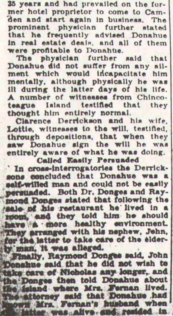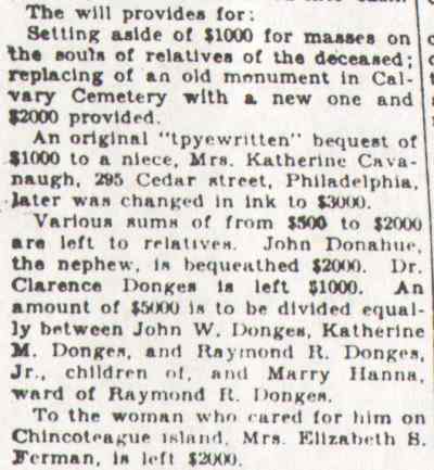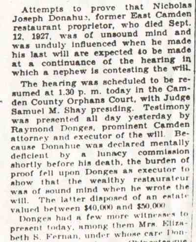 RAYMOND RENAUD DONGES was born at Donaldson, Schuykill County, Pennsylvania, November 10, 1871, the son of Dr. John W. and Rose M. (Renaud) Donges. Besides Raymond. there were two other brothers, Clarence Donges who, like his father, served as a physician in Camden for many years; and Ralph Waldo Emerson Donges. Raymond Danges studied law under the tutelage of howard carrow. both raymond and Ralph W.E. Donges went into the legal profession, and had distinguished careers. The brothers began practicing in the 1890s, and had a law firm which at one time also employed Wilbert V. Pike, who was also quite well known in Camden legal circles. Raymond R. Donges married around 1911. At the time of the 1930 Census he nad wife Katherine lived at 2 Wellwood Avenue in Merchantville NJ with their children John, Katherine M. and Raymond R. Jr. Mrs. Donges was well known in the 1920s as a person of note within the Democrat Party in Camden County. Raymond Renaud Donges passed away on April 8, 1937. |