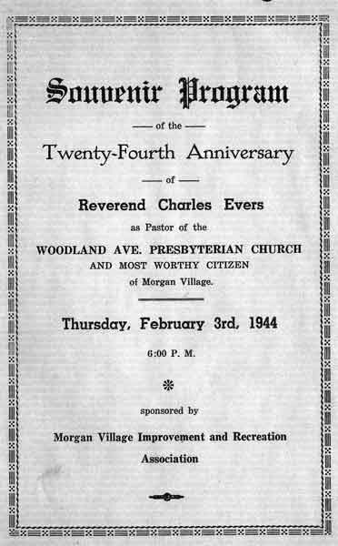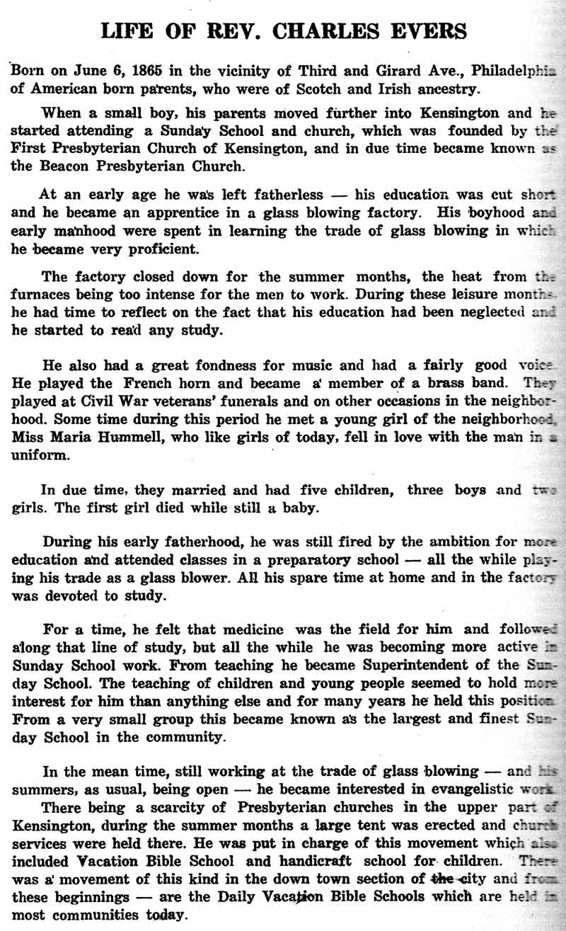 REV. CHARLES EVERS was born in Philadelphia, Pennsylvania on June 6, 1865 to Thomas Evers Jr. and the former Sarah Wilson. His father passed in 1880. On July 25, 1888 Charles Evers married Maria Hummel in Philadelphia at Siloam Methodist Episcopal Church in Philadelphia. A glassblower by trade, he was called to the ministry late in life. He was ordained as a minister in 1913 and served for several years in Bridgeton. Rev. Evers and family were living at 605 Belgrade Street in Philadelphia when the Census was taken in January of 1920. The following month he came to Camden, where he served as pastor of Woodland Avenue Presbyterian Church for the rest of his days. By 1923 the family had moved to 806 Morgan Street. When the 1924 City Directory was compiled the Evers family had moved to 829 Morgan Street. Rev. Evers died of a heart attack on Sunday, January 27, 1946 at his home at 829 Morgan Street. Services were held on January 30 and he was interred at North Cedar Hills Cemetery in Philadelphia, Pennsylvania. A city park at Morgan Boulevard and Fairview Street was named in his memory. |