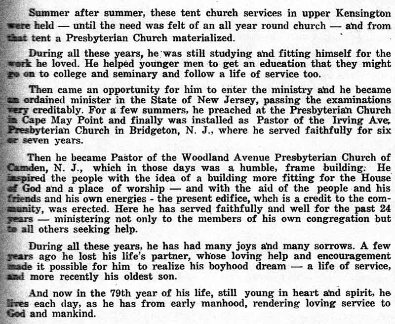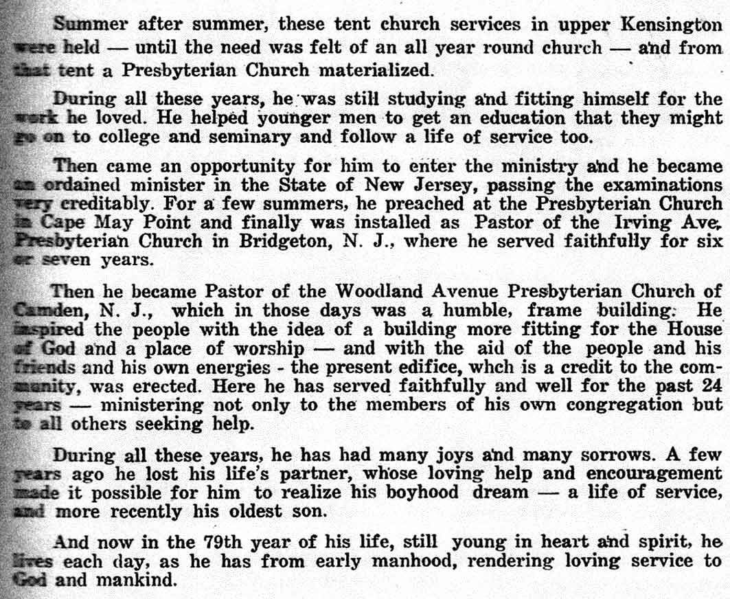 Fifth Anniversary of Rev. Whitney's Pastorate to Be Observed The fifth anniversary of the pastorate of Rev. Augustus D. Whitney, Jr., of First Presbyterian Church, Fifth and Penn streets, will be observed tonight at a dinner in honor of the pastor and his wife. It will begin at 6.30 o'clock in the church. Rev. Alexander Mackie, pastor of Tully Memorial Church, Sharon Hill, will be toastmaster. Guests will be Rev. William Chalmers Covert, former moderator of the General Assembly; Rev. Thurlow G. Cole, professor of religious education, Crozer Seminary; Rev. William R. Rearick, of North Mutchmore Church, Philadelphia; Rev .. J. Shackleford Dauerty, Moorestown Presbyterian Church; and Rev. Charles Evers, Woodland Avenue Presbyterian Church. Patronesses are: Mrs. Mary Crawford, Miss Lillian Craig, Miss Etta Duncan, Mrs. Frank Fithian, Mrs. F. B. Garrison, Mrs. S. Russell Greene, Mrs. Joshua C. Haines, Miss Hannah Hood, Mrs. Eva H. Harkness, Mrs. Sarah M. Lacy, Mrs. Robert W. Montgomery, Mrs; Louise B. Marchant, Mrs. Elizabeth McPherson, Mrs. Sarah J. Mechling, Mrs. Benjamin G. Mickle, Mrs. Anna C. Preisendanz, Miss Ellen Plant, Mrs. Louisa B. Reeves, Miss Edith Rogers, Miss Kate Reed, Mrs. Edwin L. Seabrook, Mrs. Chester D. VanDuyne, Mrs. Lucy F. VanSciver and Mrs. William Walker. |