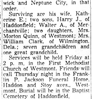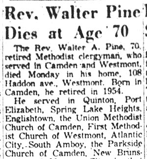 REVEREND WALTER AGNEW PINE SR. was born in Camden, New Jersey to John W. Pine and his wife, the former Emma Carney Bakely, on December 29, 1887. The 1888-1889 Camden City Directory shows John W. Pine at 333 Chester Street. The 1890-1891 Directory lists the Pines at 1010 Carpenter Street. The family was living a 530 Washington Street at the time of the 1900 Census. BY 1906 John Pine and his family had moved to 1015 Carpenter Street. When the next census was taken, in 1910. Walter A. Pine had married and was living with his wife, the former Katherine E. Welch, and their son Harry, not yet two, at 908 Lawrence Street. This was the home of Mrs. Pine's widowed mother-in-law, Amanda Welch, and her three brothers, John, Herbert, and Frank Welch. Walter Pine was then working as a machinist. When he registered for the draft in June of 1917, Walter Pine was working for the Victor Talking Machine Company, and was living at 910 Lawrence Street. The Census of 1920 shows the Pine family, which now included daughter Edna and son Walter Jr., living at 927 Lawrence Street. Walter A. Pine Sr. was still working at the Victor Talking Machine factory. He soon after received his call, and after ordination as a minister served all over South and Central New Jersey, including two posts in Camden, at the Union Methodist Church and at the Parkside Methodist Church. He was living and working in Atlantic City in the summer of 1942. Reverend Pine retired in 1954. He died at his home in Westmont on his 70th birthday, December 29, 1957. |