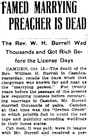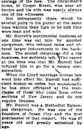REVEREND WILLIAM H. BURRELL was born in Pennsylvania around 1822. He entered the ministry at an early age, and in 1852 was the first pastor of Siloam Methodist Church in Bethel Township, in Delaware County PA. Reverend Burrell was living in Hatboro PA in 1865 when his son William B.M. Burrell was born. There were at least 4 other children, Margaret, Lillie, Harry, and Alma. The Burrell family had moved to Philadelphia by 1870. In 1879 Reverend Burrell was one of four Methodist ministers, the others being Ezra B. Lake, James Lake , and S. Wesley Lake, who chose the island known as peck's Beach as a suitable spot to establish a Christian retreat and camp meeting, on the order of Ocean Grove. Having chosen the name "Ocean City", the founders incorporated the "Ocean City Association", laid out streets and sold lots for cottages, hotels and businesses. The Tabernacle was built between Wesley and Asbury Avenues and between 5th and 6th Streets. Camp Meetings were held by the following summer. Reverend Burrell and his family were living on North 13th Street in Philadelphia when the 1880 Census was taken. He moved to Camden a few years later. Reverend Burrell settled at 43 Cooper Street, near the ferries. Reverend Burrell became known far and wide as Camden's "marrying parson". In the days prior to the civil licensing of marriage, Reverend Burrell performed thousands of marriages, and became quite wealthy doing it, in the parlor of his home at 43 Cooper Street. Besides his work in performing marriages, Reverend Burrell is also remembered as one of the founders of Ocean City NJ. Reverend William H. Burrell died in Camden NJ on October 14, 1909. |