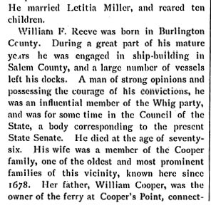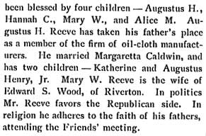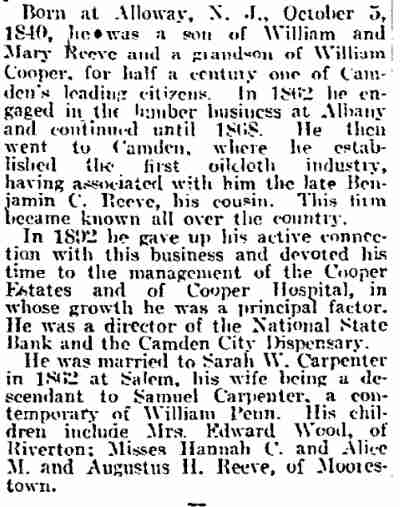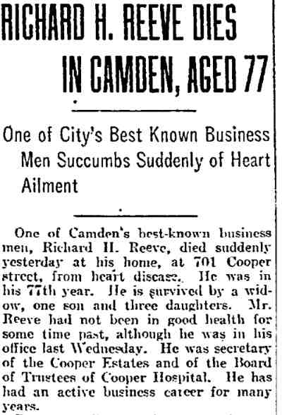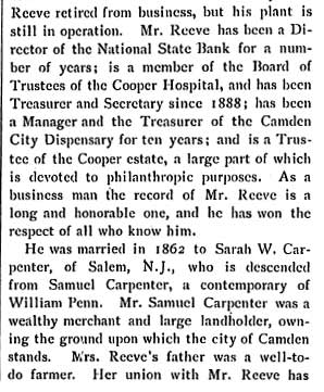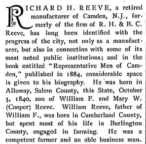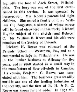 RICHARD HENRY REEVE was born in Alloway, Salem County NJ on October 5, 1840. His grandfather was William Cooper, who operated the ferry at Cooper's Point, one of the first ferries between Camden and Philadelphia. Richard H. Reeve came to Camden in 1868, and with his cousin Benjamin H. Reeve established a floor oil cloth manufacturing business that was one of Camden's leading industries in the 19th century. Their firm, R.H. & B.C. Reeve, also known as the Camden Oil Cloth Works, with its factory complex on Pine Street east of Haddon Avenue, was nationally known in its day. Richard H. Reeve's brother Augustus Reeve also came to Camden, and made his fortune in the brick manufacturing business. Richard H. Reeve retired from the oil cloth business in 1892, but remained active ion the civic life of Camden NJ. He was a trustee of Cooper Hospital, and as of 1897 had been the Treasurer and Secretary of that institution for nine years. He was also the Treasurer and was on the Board of Managers of the Camden Dispensary, and was the Treasurer of the Cooper Estate. The Camden Oil Cloth Works was acquired by the Farr & Bailey Company, which had also been in the oil cloth manufacturing business, in 1902. By 1928 the Pine Street complex was subdivided, and different business operated there over the years. The three-story tall storage building at 1350 Pine Street, last used to store waste paper, was destroyed by fire on may 8, 1972. Richard H. Reeve and his family made their home at 700 Cooper Street in Camden, near his cousin Benjamin, who lived at 640 Cooper. Richard H. Reeve passed away on February 10, 1917, survived by his daughters Alice and Hannah. |