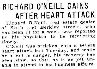 RICHARD O'NEILL was born in Camden NJ on July 14, 1886, one of at least four children born to William and Mary O'Neill. His father was an iron moulder. The family lived at 728 Market Street when the census was taken in 1900. Richard O'Neill married around 1909 and went into the real estate business around 1911. When he registered for the draft in June of 1917, he was married with two children, and living at 457 South 6th Street. The family, which included wife Anne, daughter Evelyn and son Richard Jr., were still living at 457 South 6th Street when the census was taken in 1930. Still a resident of 457 South 6th Street, Richard O'Neill died from a sudden heart attack on July 1, 1958. Richard O'Neill's family were still living at the South 6th Street address as late as 1956, and were still listed under his name in the New Jersey Bell Telephone Directory. They were not listed, however, in the October 1959 Directory. |