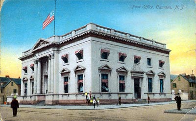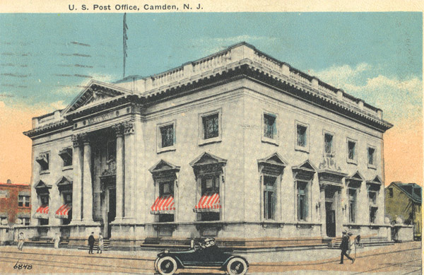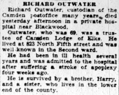 RICHARD OUTWATER was born in Camden in 1858 to Richard and Ellen Benson Outwater. When the census was taken in 1860 the family included five older children. The elder Outwater was then employed as a ship's engineer. Another daughter, Emma, was born around 1865, however by mid-1870 Ellen Outwater appears to have been widowed. When the census was taken again in 1880, only Richard, then 21, was still at home, living with his mother at 323 Market Street. He was then working in a jewelry store, a trade he followed through at least 1891, either for or in partnership with William Otis Sheppard, at 215 Federal Street. He appears in Camden City Directories between 1887-1888 and 1890-1891 a s living at 413 Pine Street, near engine company number 1 of the Camden Fire Department, which was at 409 pine. Older brother Robert lived and worked as an upholster in these years at 329 s tevens Street , just around the corner from poet Walt Whitman. Mother Ellen was living at 507 Federal Street, working as a "layer out of the dead", that is, as an undertaker's assistant. Richard Outwater appears to have married and been left a widower by 1910. At the time of the census that year he had been hired as the custodian of the the Post Office which stood at North 3rd and Market Streets. He was then renting a room at 120 North 8th Street from Mr. and Mrs. William M. Moon. During this time he was an active member of the Elks Camden Lodge No. 293, and served as a trustee of that organization. He later moved to 823 North 5th street in North Camden. Richard Outwater remained with the Post Office until ill health dictated the end of employ. He suffered a stroke in January of 1928 which ended his life on February 8th of that year. |