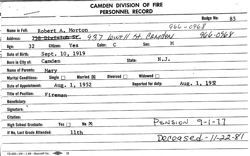 Robert A. Morton was inducted into the United States Army on August 26, 1942. After completing his military service he returned to Camden. The 1947 City Directory shows Robert A. Morton living at 816 South 8th Street. Robert A. Morton was appointed to the Camden Fire Department on August 1, 1952. He was then living at 758Division Street. He moved to 937 Lowell Street during the 1960s.