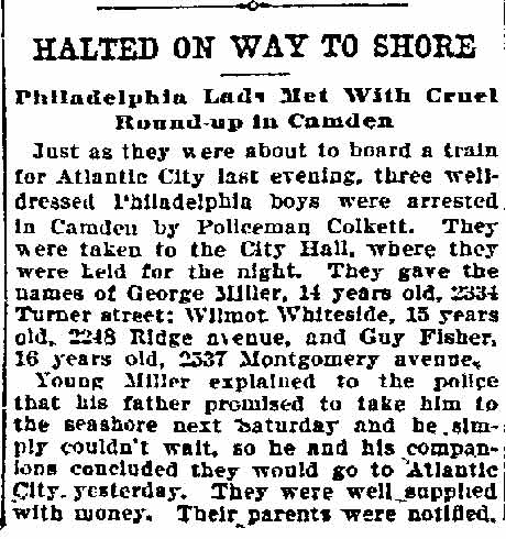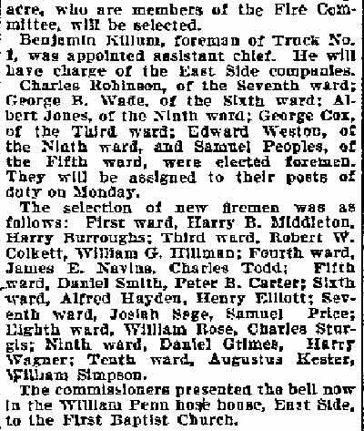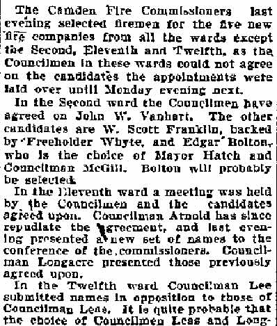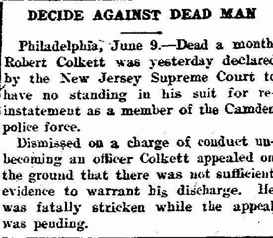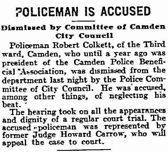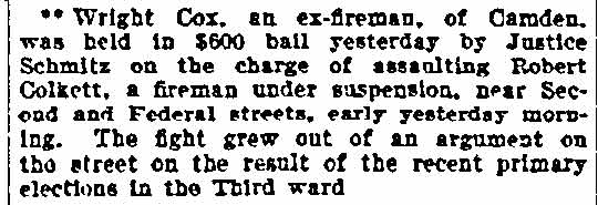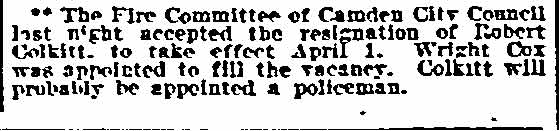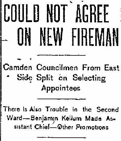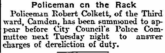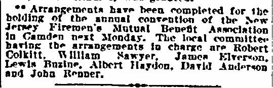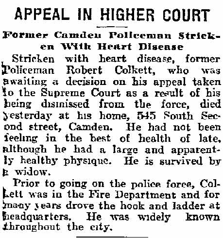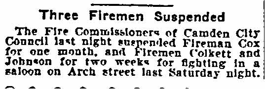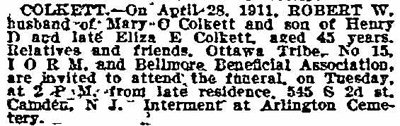 ROBERT COLKETT was born on October 11, 1865 to Henry Colkett and his wife Eliza. Quite active politically, Robert Colkett was appointed to the Camden Fire Department in November of 1899 and began service on March 1, 1900 with the Hook & Ladder Company, now known as Ladder Company 1. He resigned from the Camden Fire Department on February 28, 1905 and went to work as Camden police officer. Robert Colkett was dismissed from the Police Department in 1910. Shortly after the 1910 Census was enumerated, Robert Colkett moved to 545 South 2nd Street. He passed away unexpectedly on April 28, 1911. He had been a member of Ottawa Tribe No. 15, Improved Order of Red Men and also had belonged to the Bellmore Beneficial Association. |
