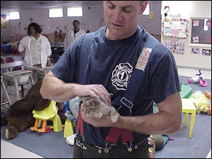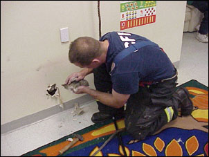 CAMDEN, N.J.—Engine Co. One Had just finished up their morning in-service training when they were dispatched to a Child Care Center in the 300 block of Elm St in the North Camden section of the city for an investigation. When they arrived they were told by workers that they could hear a noise coming from the inside wall in the children's play area. Captain Bob Dowhy along with Firefighters Andy Magee, FF. Elvis Hines, FF. Eshu Ryan, could hear what sounded like a small kitten crying from inside the wall. After checking the ceiling and the other walls no one could figure out how the kitten could have gotten inside the wall Firefighters had on other choice but to punch a small hole in the wall. Firefighter Magee reached in and pulled out a very small crying kitten, much to the delight of all the workers looking on. The kitten looked well fed and was not injured in any way and was turned over to the Center's staff who gave it some cool milk. Engine One's members picked up their tools and went back in-service after another job well done.