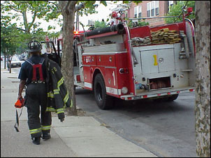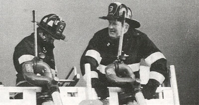 May 25, 1996, fire fighters Robert Dowhy (left) and Robert Worrell (right) are preparing to go in service with master streams from Tower Ladder #3 at a 3 alarm fire at South 24th Street. photo provided by Joel Bain