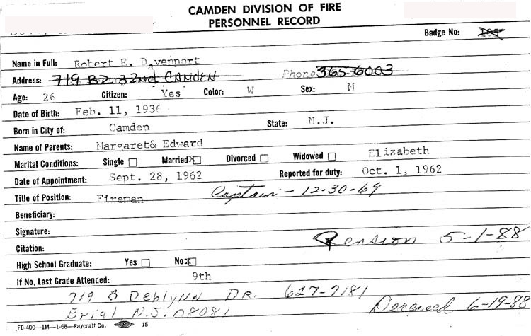ROBERT E. DAVENPORT was born in Camden, New Jersey on February 11, 1936 to Margaret and Edward A. Davenport. He was named after his paternal grandfather, Robert Allen Davenport, who had brought his family to Cramer Hill during the 1910s. By the fall of 1918 the Davenport family was living at 2831 Garfield Avenue, where they remained well into the 1980s. Robert E. Davenport attended high school trough the ninth grade when like many other boys of his era, he went to work. On September 28, 1962 Robert E. Davenport was appointed to the Camden Fire department. He reported for duty on October 1. His abilities quickly recognized, Robert E. Davenport was promoted to captain on December 30, 1969. He was then living at 1026 reeves avenue in Cramer Hill where he would remain for at least one more year. His father passed away in 1973, his mother, however would remain at the Garfield Avenue address for several more years. Robert E. Davenport and his wife Elizabeth would move out of Camden by 1977. The New Jersey Bell Telephone Directory for that year shows the Davenports on Deblynn Drive in Erial, New Jersey. Captain Davenport left the Fire Department on pension on May 1, 1988. Sadly, he passed away on June 19, 1988.