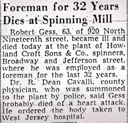 ROBERT GESS was born in Pennsylvania in 1887. He more than likely was the son of Robert and Dora Gess, The elder Gess appears in the 1890-1891 Camden City Directory as a cabinetmaker living at 1923 Fillmore Street in Camden; he was living at 417 Liberty Street when he died of liver disease in October of 1917. Robert Gess worked for many years at the Howland Croft Sons & Co. textile mill at Broadway & Jefferson Street in Camden NJ, one block from the Fillmore Street address. He became a foreman at the plant about 1918. At the time of the 1920 Census, Robert Gess was living with wife Annie and daughters, Dorothy, Anna, and Mary at 333 Liberty Street. His widowed mother and brothers George and Frederick lived in the next block, at 427 Liberty Street. Six houses down, at 413-415 Liberty Street, lived Reyquew Hyghcock, who would gain notoriety in the 1920s as Camden's "Voodoo Doctor". Annie Gess died of cancer in October of 1926, leaving her husband and three daughters. Robert Gess remarried shortly thereafter. 1932 was a bad years, as brother Frederick died of pneumonia in February and his mother Dora passed in April of kidney disease. Robert Gess appears in the 1947 Camden City Directory as living with his wife Rhoda at 920 North 19th Street in the Cramer Hill section of Camden. On June 28, 1950 Robert Gess suffered a fatal heart attack while at work. He was survived by his wife Rhoda, who remained at the North 19th Street address into the 1970s. She passed away in November of 1975. |