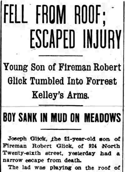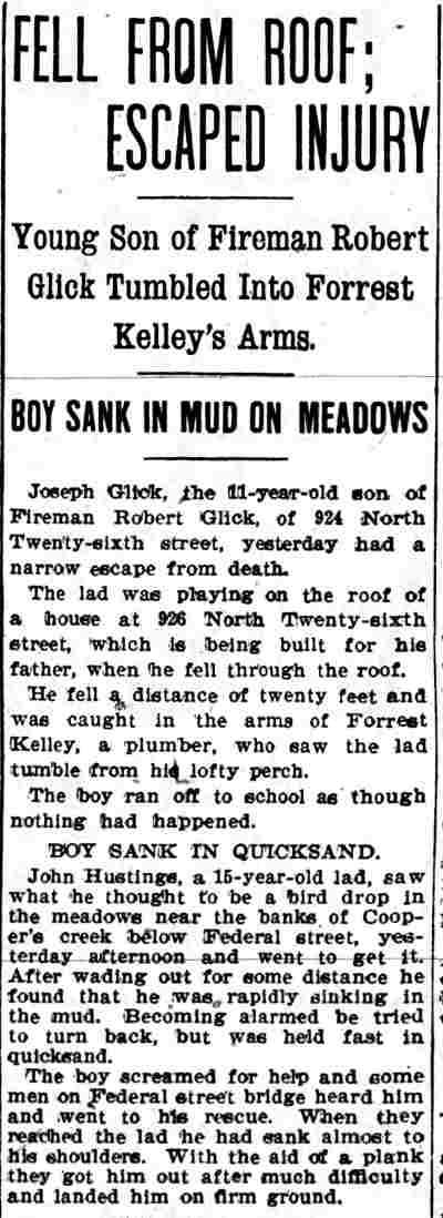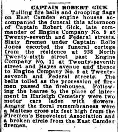 ROBERT GICK was born in Philadelphia, Pennsylvania in 1857, the son of Christopher Gick. By 1887 he had moved to what was then called Main Street in the Pavonia section of Stockton Township. This area is commonly known today as the Cramer Hill section of Camden. Main Street was renamed North 26th Street by 1905. He appears in the Camden City Directories from 1887 through 1891 as being employed as a driver. Robert Gick became a volunteer firefighter during this period. He began his career as a volunteer with Pavonia Hose Company No. 3 at Cambridge Avenue and River Road. Robert Gick was elected Chief of the Stockton Fire Department in 1897, and joined Camden's paid fire department as a firefighter when Stockton was merged into Camden, eventually becoming Lieutenant of Hose and Chemical Company Number 2. Robert Gick married Anna Miller, and their were at least three sons. One son, Howard L. Gick was born on August 22, 1895 in Camden. Howard L. Gick followed his father into the Camden Fire Department, serving 33 years, before retiring as a Battalion Chief in 1956. Charles Gick, the eldest, lived for several years at 2744 Pierce Avenue in Cramer Hill. By 1906 Robert Gick and his wife Anna lived at 928 North 26th Street in Camden's Cramer Hill neighborhood. They lived next door to Henry and Sophia Strahle, who operated a tavern known as Strahle's Hotel, and later as the Pavonia House. Robert Gick was still working for the Camden Fire department when the census was taken. Robert Gick passed away on November 30, 1926 and was buried at Harleigh Cemetery. He was survived by his sons and wife Anna. |