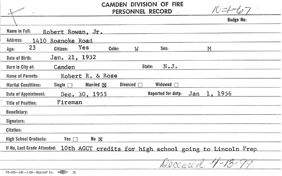 ROBERT RICHARD ROWAN JR. was born in Camden, New Jersey on January 21, 1932 to Robert and Rose Skroski Rowan. He grew up in North Camden with his brother Ronald and sister Rita. Robert R. Rowan Sr. worked as a foreman with Camden's engineering and traffic maintenance department. After serving in the Far East with the United States Army, Robert R. Rowan Jr. was appointed to the Camden Fore Department on December 30, 1955. He became engaged to Miriam F. McGlinchey in 1953 and married upon returning to the USA. They young Rowans lived at 58 Erie Street in December of 1955 and remained at that address into 1959. By February of 1960 they had moved to 1038 Lois Avenue in Cramer Hill. They later moved to 1410 Roanoke Road. After retiring from the Fire Department, Robert Rowan moved to 1410 Roanoke Road in Glendora, New Jersey. He died on April 13, 1999. |