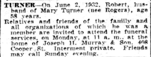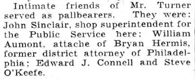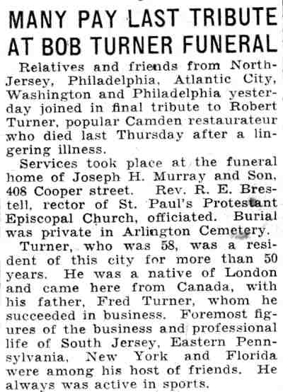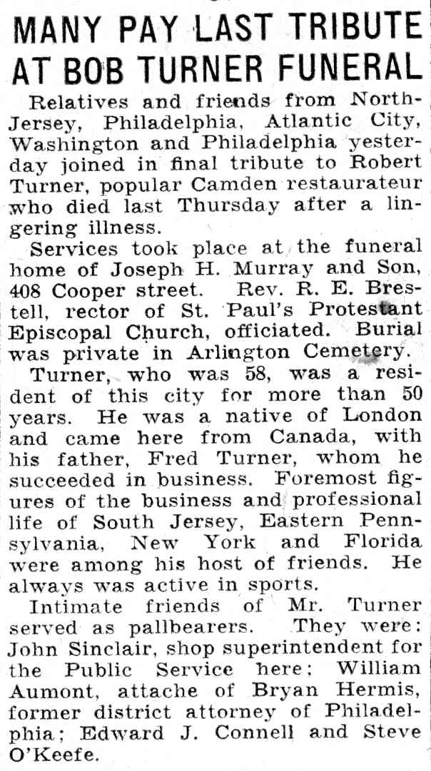 ROBERT A. TURNER was the son of Frederick Turner, who emigrated from England to Camden and founded a restaurant at 234 Federal Street, where he lived, in 1886. This restaurant came to be known as Turner's Oyster House, and was part of the Camden dining scene for over sixty years. Frederick Turner moved his business to 210 Federal Street in 1890. Oysters were quite plentiful in Delaware Bay up until 1976 when a sea-borne disease ravaged the species. The oyster industry in that part of South Jersey has never recovered. Fred Turner passed during the 1890s and his son carried the business forward. In 1913 he renovated 201 Federal Street and the adjoining property at 212 Federal Street, converting both for use as a restaurant. When the 1930 Census was taken, Robert Turner was running the restaurant, which now was at 212-214 Federal Street. Robert Turner was then 56 years old. Born in England, he married his wife, the former Mary Rogers, at the age of 20. Mr. and Mrs. Turner lived on premises with their daughter Helen Becker, then 36, and a grandson, Robert, 17 years of age. Robert Turner passed away on June 2, 1932. The 1947 Camden City Directory shows Helen Becker operating a seafood restaurant at the address,. |