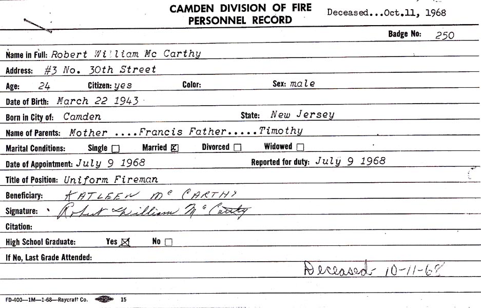 Robert McCarthy was appointed to the Camden Fire Department on July 9, 1968. The McCarthy family was then living at 3 North 30th Street in East Camden