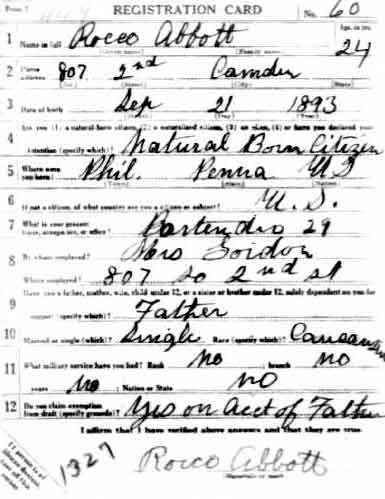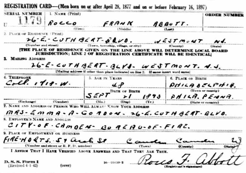 ROCCO FRANK ABBOTT was born in Philadelphia on September 21, 1893 to Frank and Maria Abbatto. By 1910 his family had moved to Camden, New Jersey. Rocco Abbott lived with his parents at 910 South 3rd Street. His older brother Antonio, a tailor, lived around the corner at 302 Spruce Street. The 1914 Camden City Director indicates that the family had Americanized their last name from Abbatto to Abbott. Rocco Abbott was still living at 910 South 3rd Street at that time In June of 1917, when he registered for the draft, Rocco Abbott was working as a bartender at Gordon's Hotel & Livery, at 801 South 2nd Street. He was living at 807 South 2nd Street. Rocco Abbott was appointed to the Camden Fire Department in the early 1920s. He was still living at 807 South 2nd Street as late as 1929. By April of 1930 he had moved to 910 South 3rd Street, where he lived with his brother Anthony. He moved to Westmont in the 1930s. Still with the Camden Fire Department in the spring of 1942, Rocco Abbott was then staying at 26 East Cuthbert Road in Westmont, with his former employer, Mrs. Emma Gordon, then lived. He remained at this address until his passing in October of 1968. It is not known as of this writing when Rocco Abbott left the Camden Fire Department. He would have had to take a mandatory retirement at age 65. Rocco Abbott's first cousin, Frank A. "Chick" Abbott, served for many years as a Camden city commissioner and Director of Public Works. |