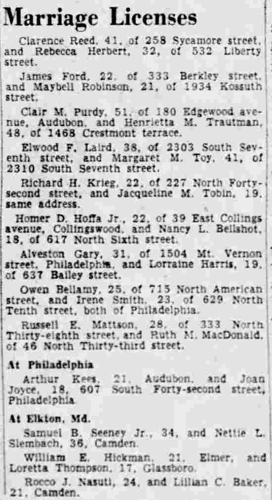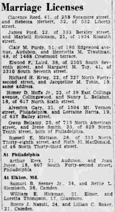Nasuti received his discharge in 1946 and was employed for a short period with Hollingshead Co. He then was employed as a carpenter's apprentice with the Pennsylvania Railroad, where he is still employed as a carpenter. Rock married Lillian Baker in build-1949, and the Nasutis are now four, including Gary, aged six, and Glenn, two. After some convincing of his brother-in-law, Bill Flemming, Rock joined the Cramer Hill Boys Club in 1956 and became active as Flemming's coach of the Robin teams of 1956 and 1957. Each -year the Robins were champions of the Little League. While Rock is the type of fellow who weighs his words at club meetings he never hesitates in assisting on committees. In 1958 he was co-chairman of the fair committee, chairman of the football refreshment stand in 1958, chairman of our 1958 Christmas party, co-chairman of our 5th annual birthday party, and assisted on fund drives, and Little League committees. Rock makes plenty of noise on the bowling alleys, rolling a 175 average with the PRR team. |