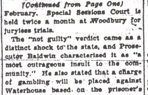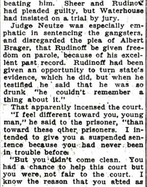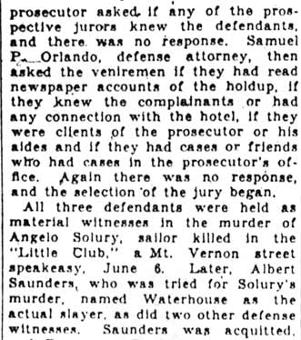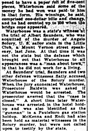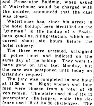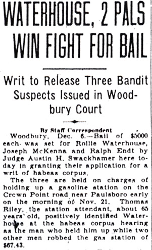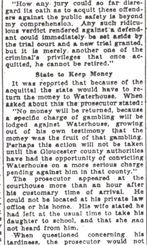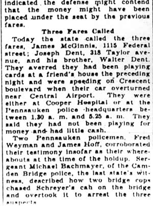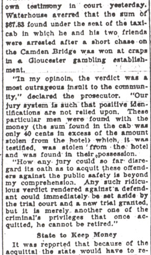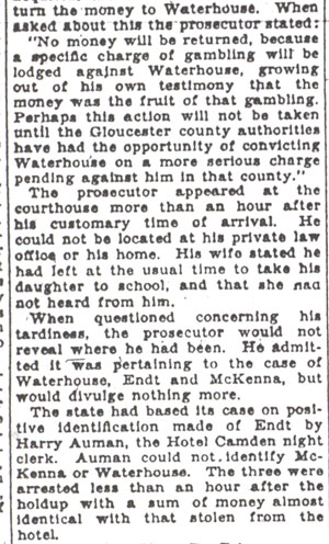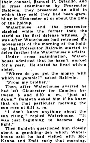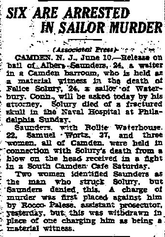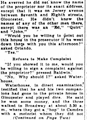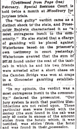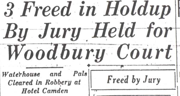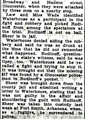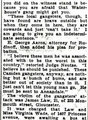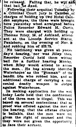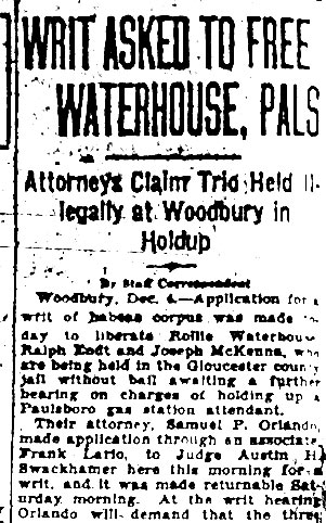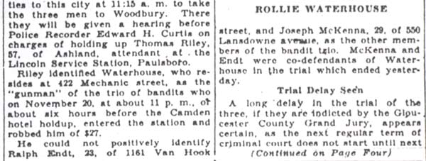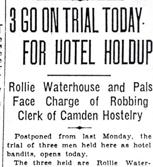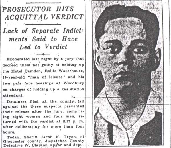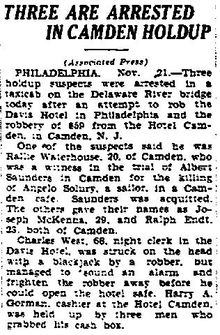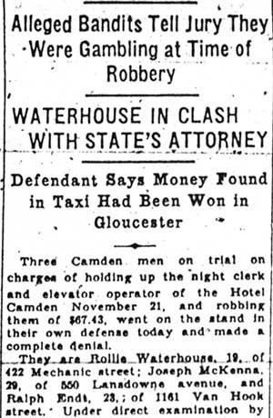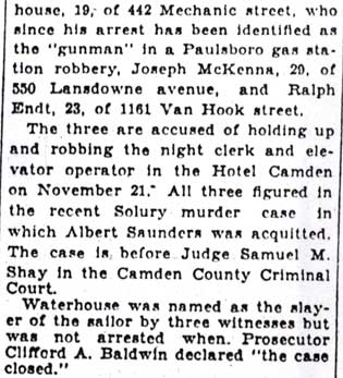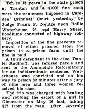ROLLIE WATERHOUSE was born Ralston J. Waterhouse on June 24, 1910 to Mr. and Mrs. Charles Waterhouse. His mother died before he was nine years of age. At the time of the 1920 Census the family lived at 511 Division Street in Camden. His older sister Ellen had married Russell "Buck" Sage later that year, and a daughter, Rose, was born shortly thereafter. By 1930 the Sage household, at 436 Mechanic Street, included Rollie Waterhouse, his brother Alfonse, sister Thelma, and his father Charles and step-mother Waterhouse. Rollie Waterhouse was then 19, and working as a laborer at one of Camden's many shipyards. Russell Sage had been arrested and questioned in a number of criminal investigations and it wasn't long that young Rolie was in trouble too. He was arrested for a November 21, 1930 robbery in Gloucester City, for which he was acquitted. On October 21, 1936 Rollie Waterhouse was convicted along with two accomplices of the May 15. 1936 robbery of James Law in Gloucester City, and sentenced to a long term at the reformatory at Annandale NJ by Judge Frank F. Neutze. After his release he came back to the area, and was living in Fairview in the late 1950s. Last a resident of Vincentown NJ, He passed away on December 26, 2001, survived by his wife Dorothy, niece Rose Sage Arenz, and nephew Jack Waterhouse. |