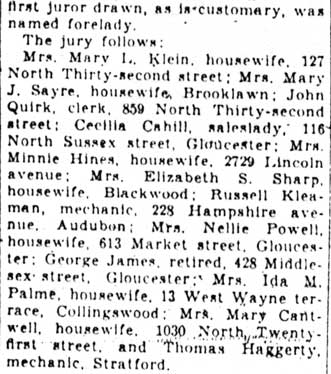 Angelo Solury - Little Cafe - Hotel Camden Mt. Vernon Street - Van Hook Street - Mechanic Street - Lansdowne Avenue North 32nd Street - Lincoln Avenue - North 21st Street Mary I. Klein - Mary J.Sayre - John Quirk - Cecilia Cahill - Minnie Hines Elizabeth S. sharp - Russell Kleaman - Nellie Powell - George James - Ida M. Palme Mary Cantwell - Thomas Haggerty |