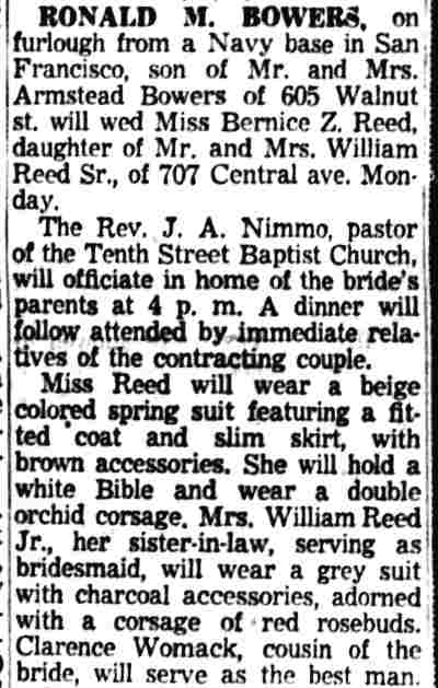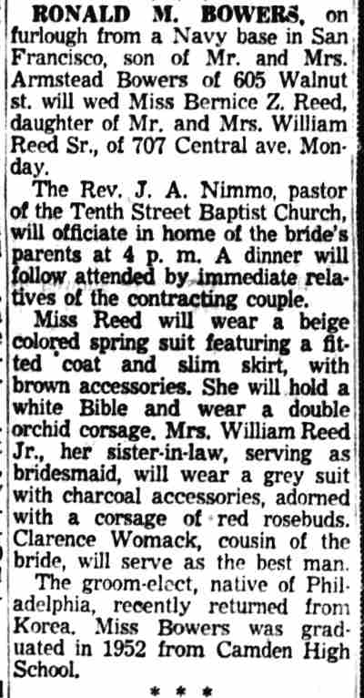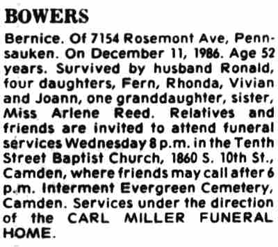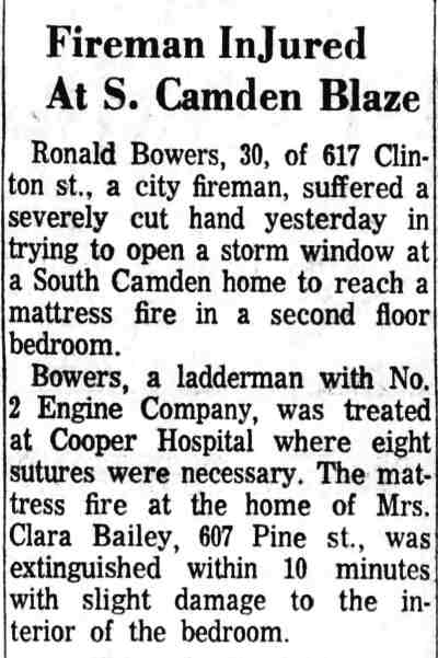 sister, Vivian. His early years were spent in Philadelphia. After coming out of the Navy, Ronald and Bernice Bowers made their home at 617 Clinton Street. He was appointed to the Camden Fire Department on June 29, 1962. After completing training Ronald Bowers was assigned to Ladder Company 2. He served over 35 years with different companies throughout the city. Ronald and Bernice Bowers had four daughters, Fern, Ronda, Vivian, and JoAnn. Sadly, Mrs. Bowers passed away in December of 1986. In